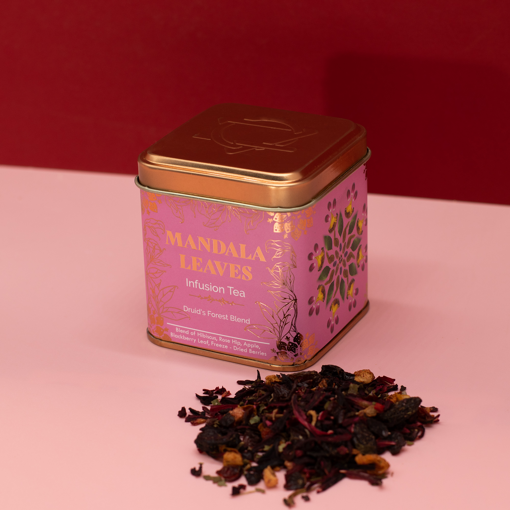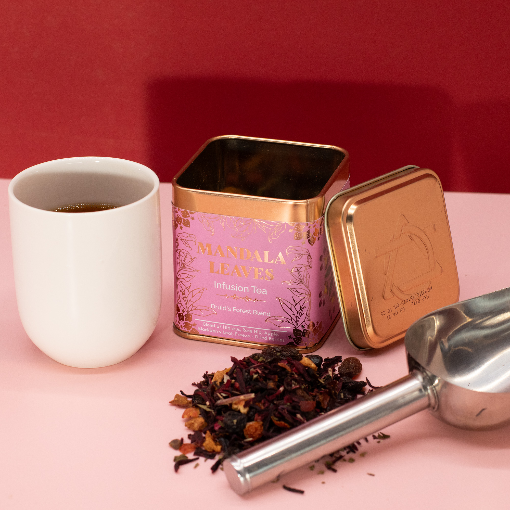 Amestecul Pădurii Druidului combină hibiscus, măceșe, măr, frunză de mur și fructe de pădure liofilizate, creând o infuzie intensă, fructată, cu o culoare natural bogată. Amestecurile pe bază de hibiscus și fructe sunt adesea asociate cu vitalitate blândă și prospețime naturală, făcând acest ceai atractiv pentru clienții care preferă opțiuni aromate, fără cofeină.