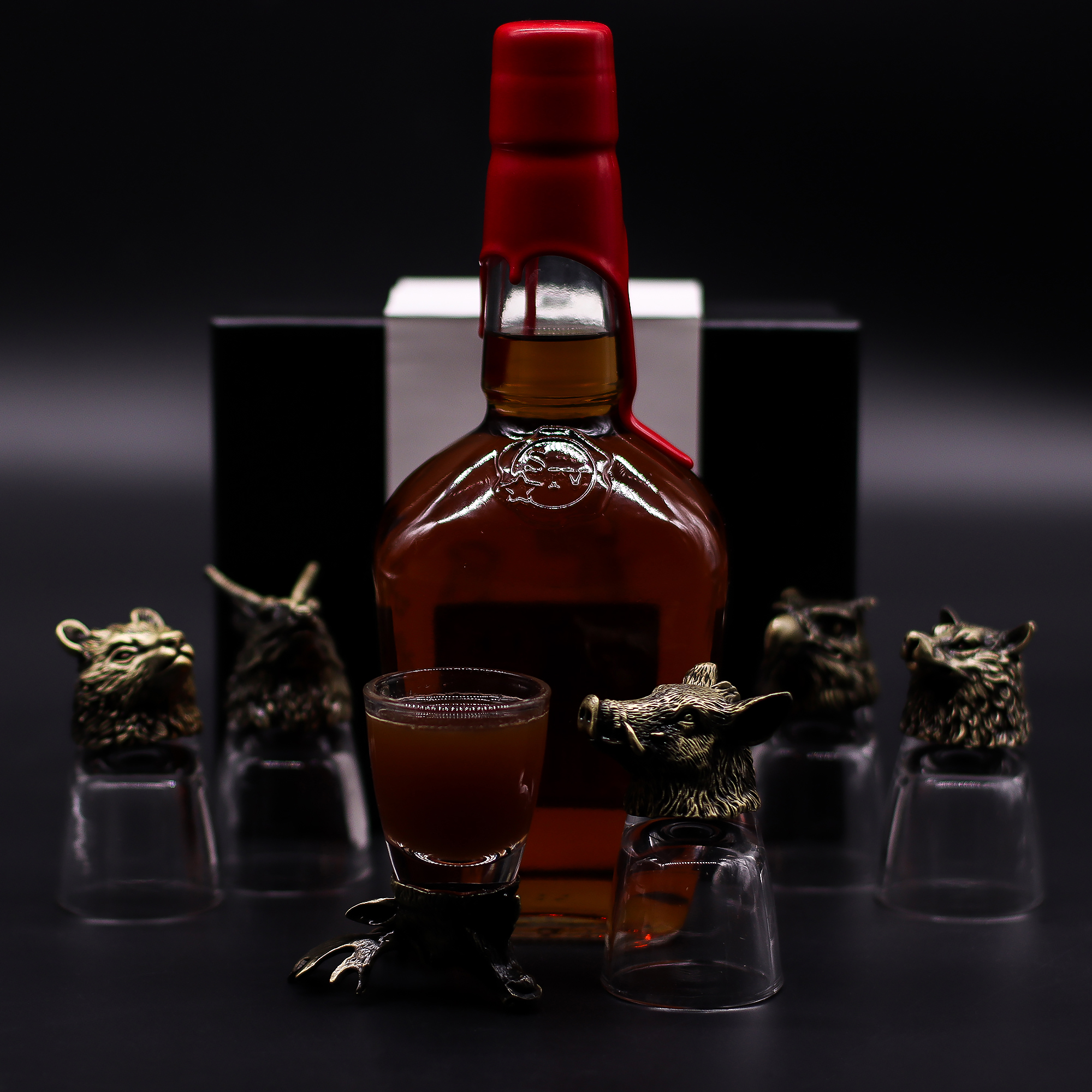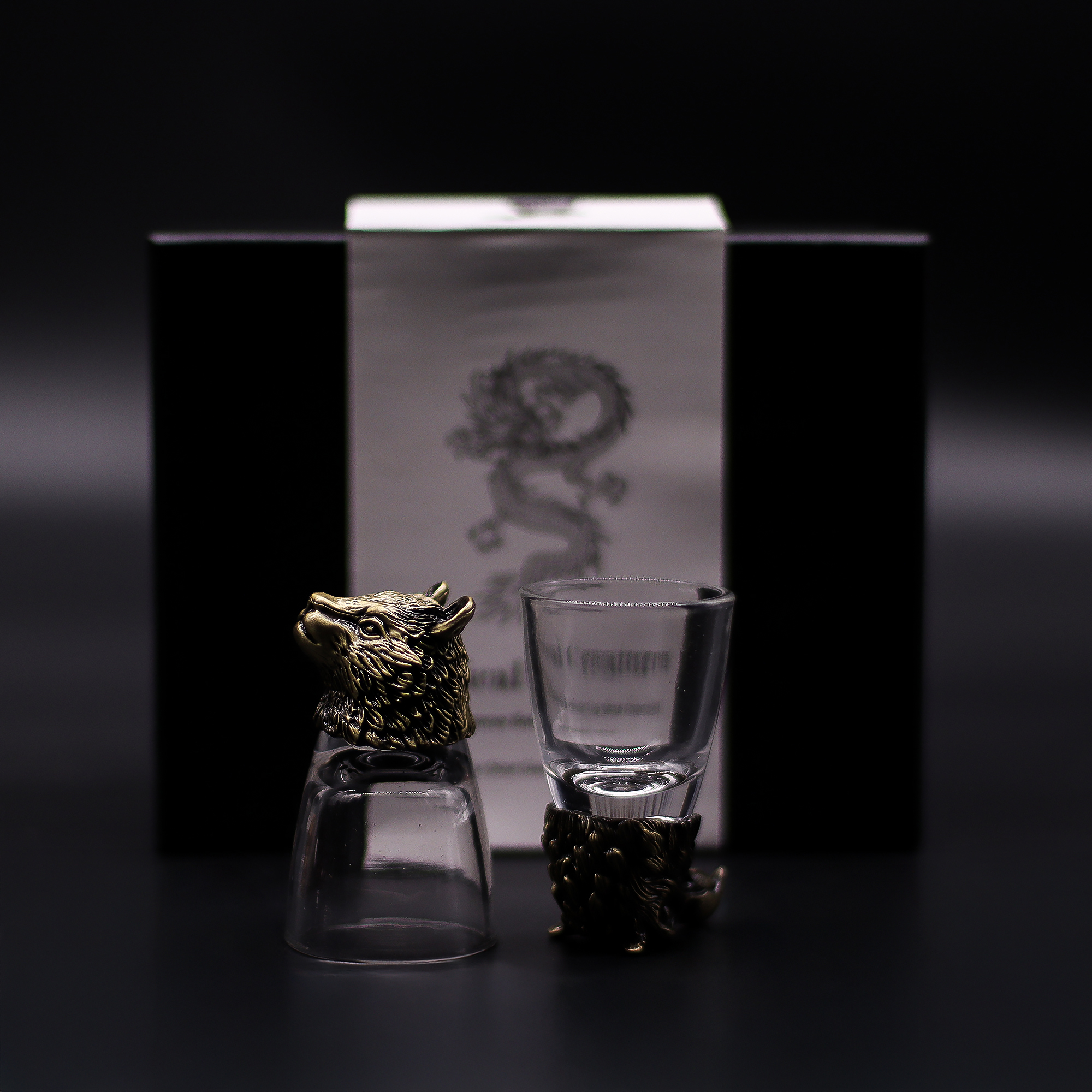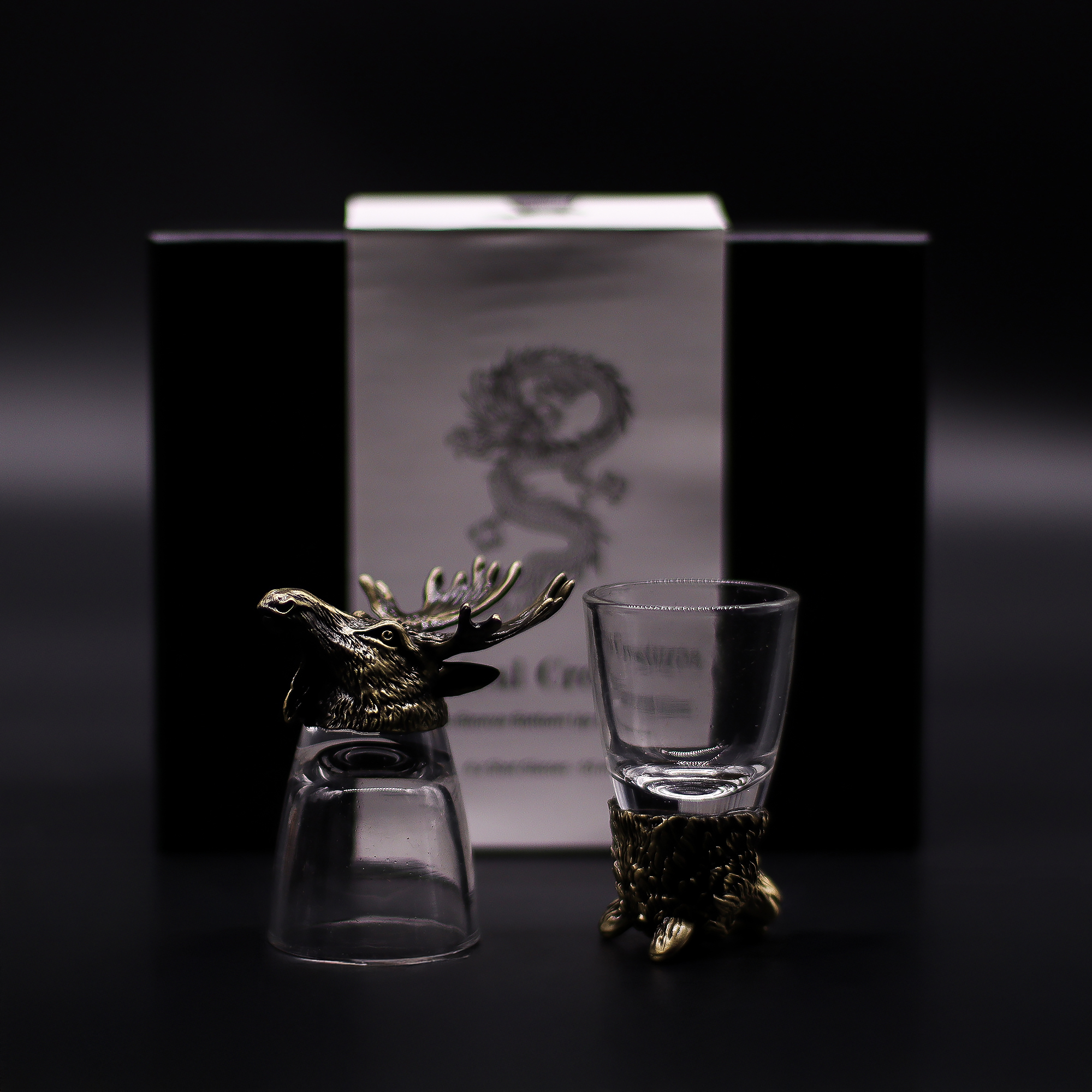 Fiecare pahar de 50 ml se sprijină pe o bază sculptată din alamă, reprezentând animale ale pădurii precum cerbul, ursul, vulturul, capra, mistrețul și lupul. Atunci când sunt întoarse invers, figurinele se dezvăluie în detaliu complet, transformând fiecare pahar într-o mică operă de artă care servește și ca element decorativ.