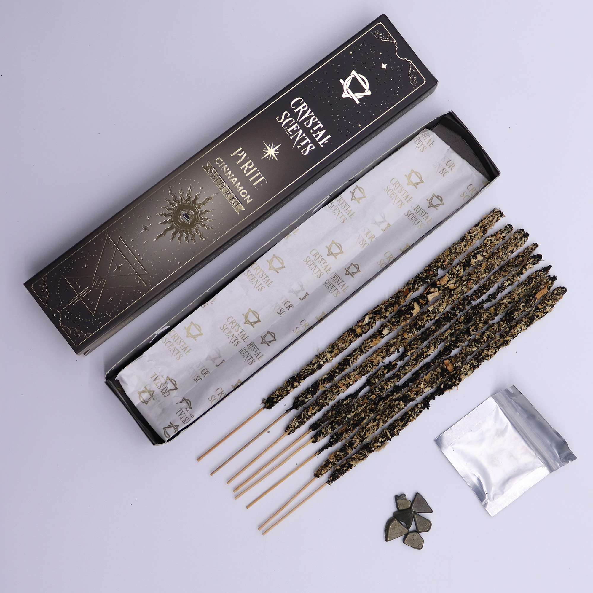 Aceste bețișoare îmbină aroma energizantă de scorțișoară cu un cristal de Pirită, creând un ritual vibrant pentru clienții care caută motivație și impuls înainte. Pirita este asociată în mod tradițional cu încrederea în sine, abundența și forța interioară. Mulți o folosesc în momentele în care au nevoie să depășească provocări, să își întărească curajul sau să atragă noi oportunități. Căldura picantă a scorțișoarei amplifică această energie tonică, ajutând la crearea unei atmosfere active și dinamizante.