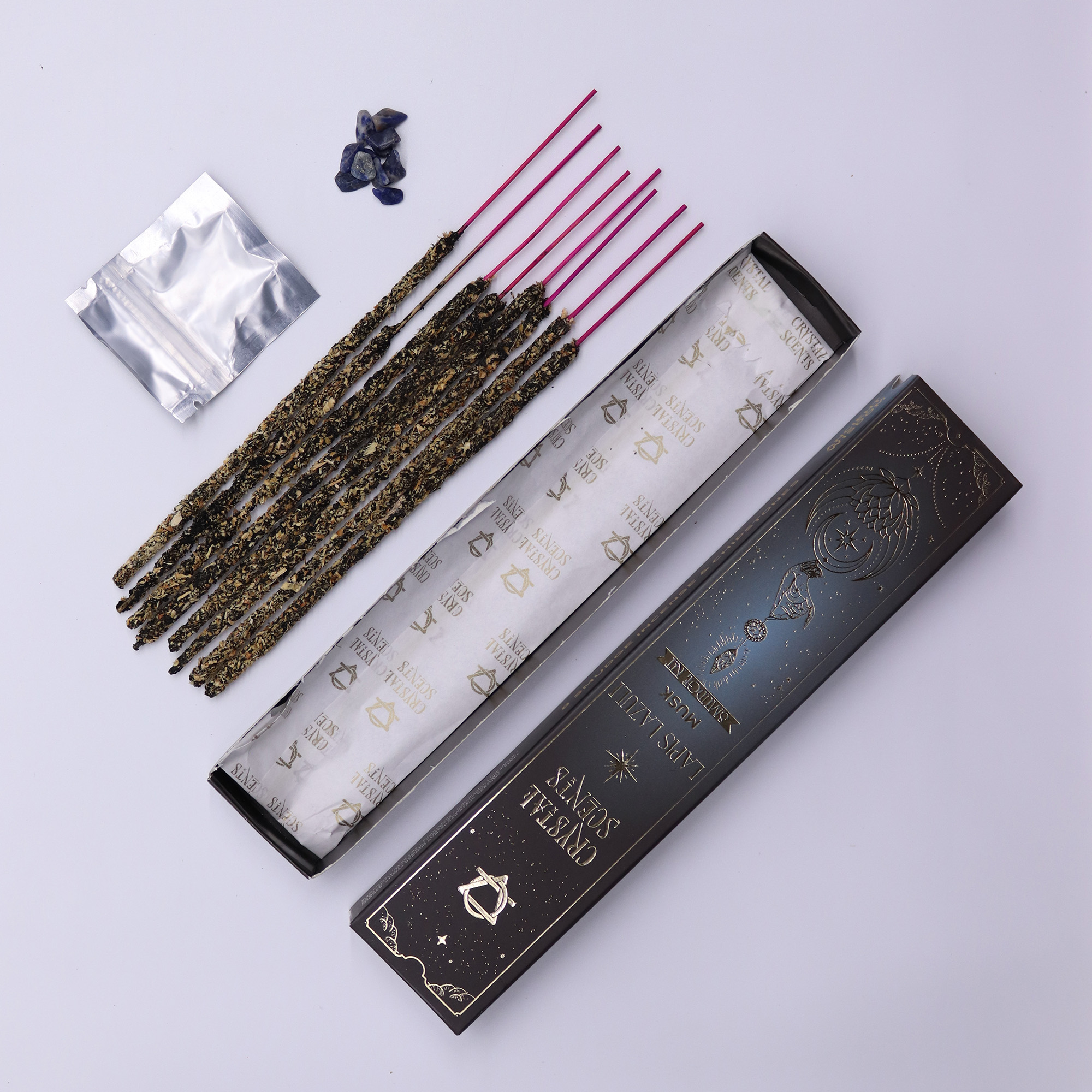 Aceste bețișoare parfumate îmbină parfumul clasic de mosc cu un cristal de Lapis Lazuli, atrăgând clienții interesați de teme precum intuiția, comunicarea și adevărul interior. Lapisul este asociat tradițional cu înțelepciunea, claritatea și exprimarea de sine. Mulți îl folosesc atunci când doresc să vorbească cu încredere, să ia decizii bine gândite sau să își adâncească înțelegerea în timpul meditației sau studiului. Aroma fină și ancorantă de mosc amplifică această calitate reflexivă.