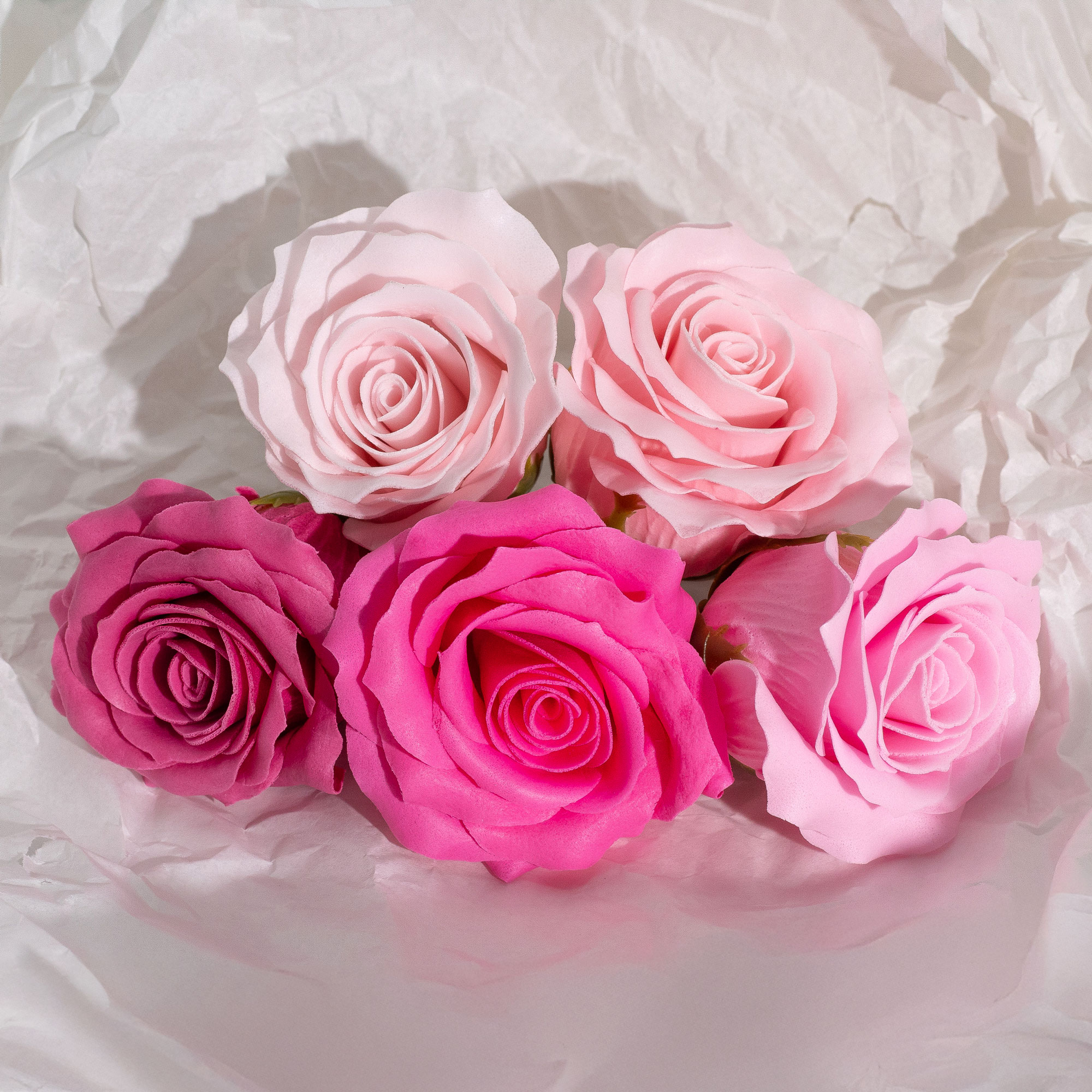 Acești trandafiri sunt ideali pentru coșuri romantice, aranjamente cadou creative sau buchete de săpun personalizate. Tonurile variate adaugă profunzime vizuală, făcând expunerile mai bogate și mai dinamice. În baie, pot fi folosiți ca accesoriu decorativ elegant sau ca săpun delicat pentru mâini.