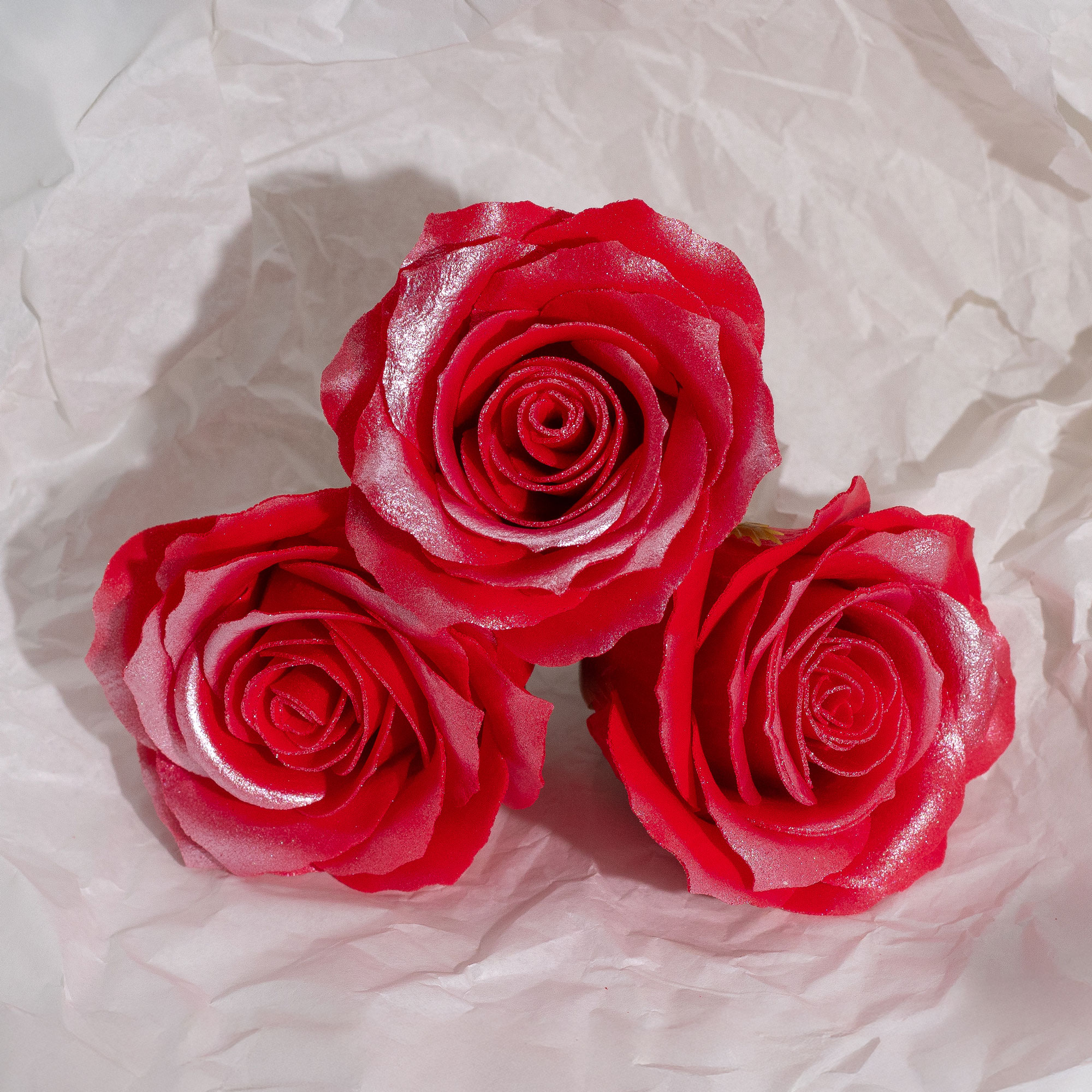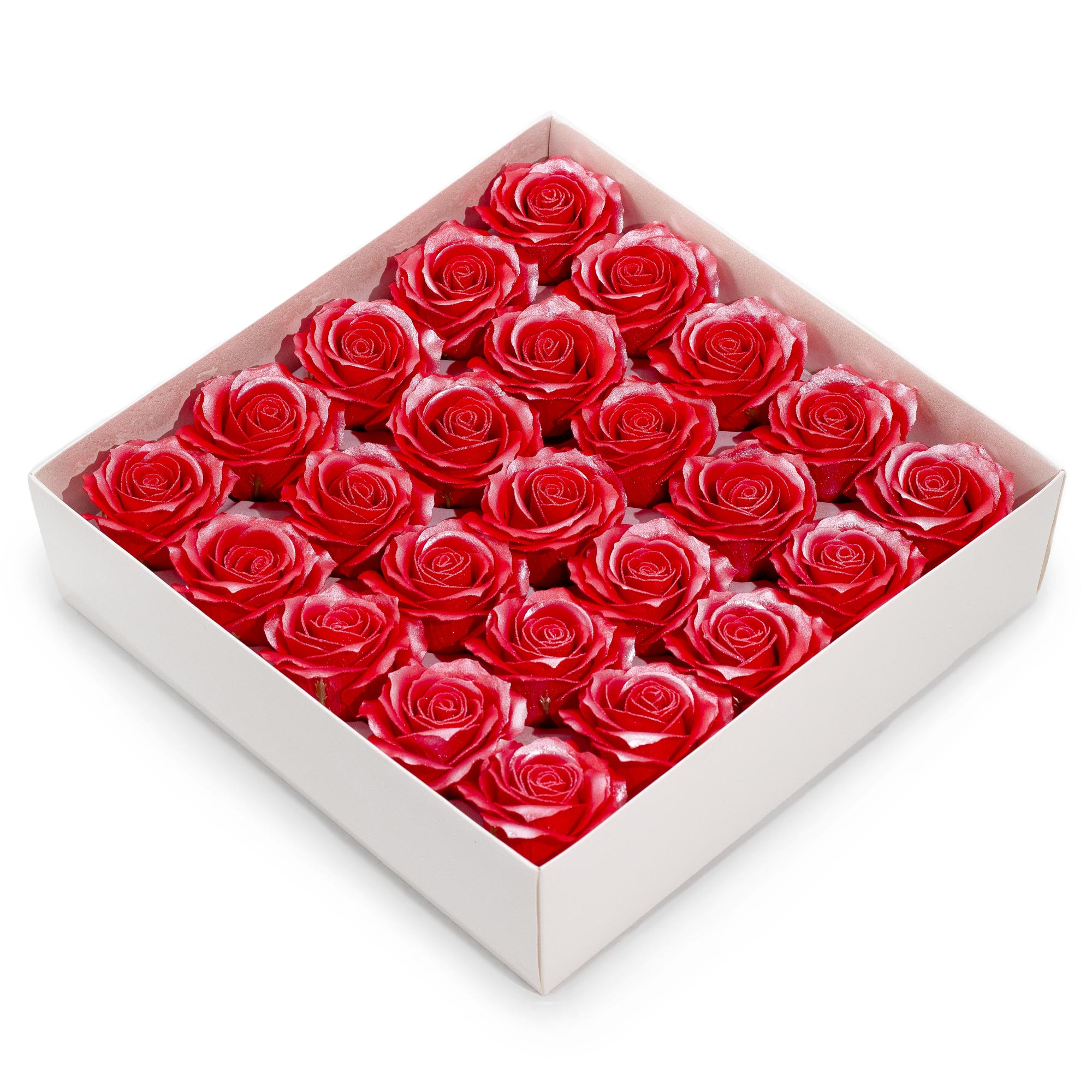 Îmbogățiți-vă gama cu nuanțele intense ale trandafirilor din săpun. Această cutie conține 25 de trandafiri cu margini din mătase, realizați manual din straturi fine de petale, într-un roșu rubiniu strălucitor. Culoarea lor puternică și parfumul discret de săpun le conferă un aer luxos și rafinat, perfect pentru aranjamente decorative, coșuri cadou sau proiecte creative de gifting.