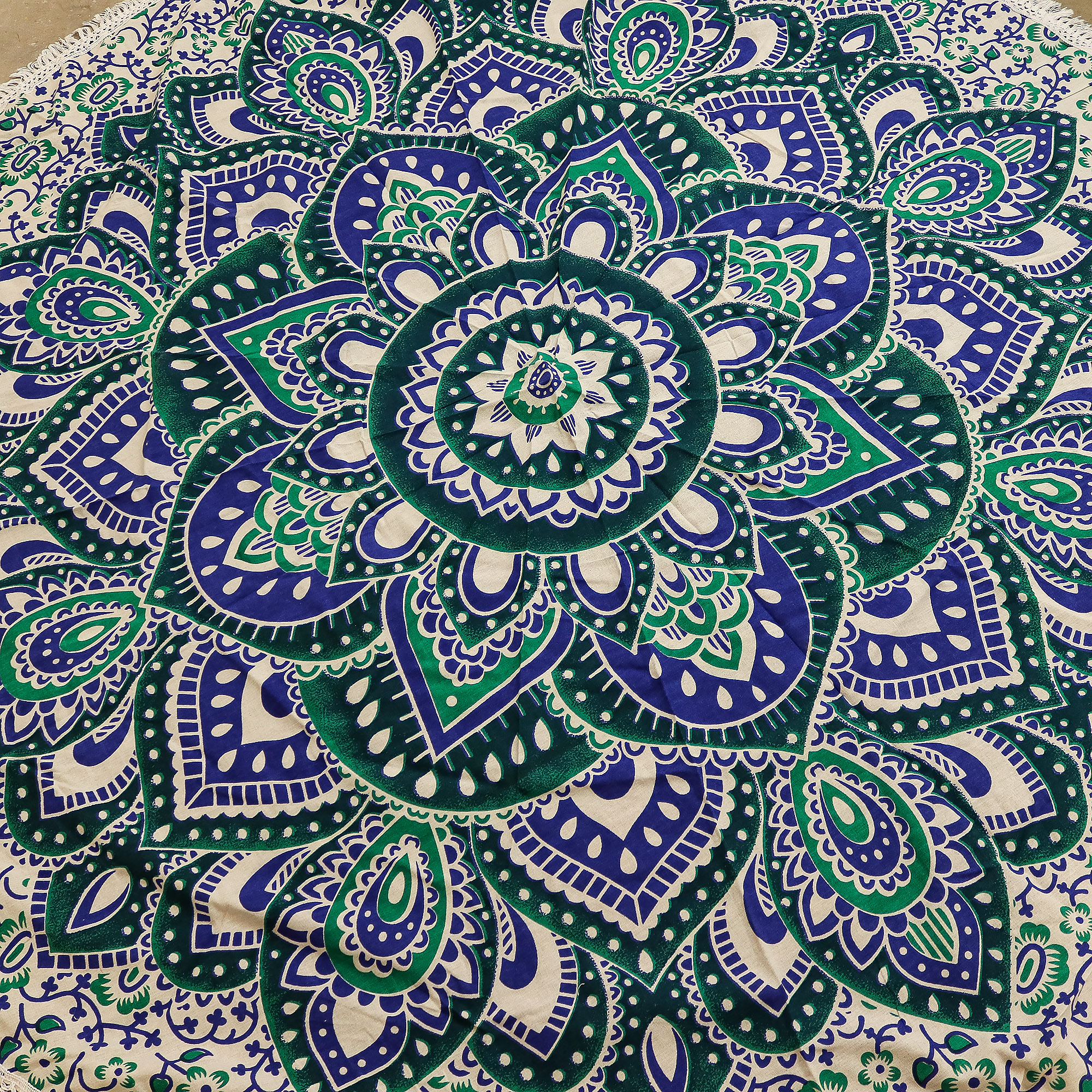 Această pânză rotundă decorativă îmbină tonuri răcoritoare de turcoaz și albastru, creând un design inspirat de mare, care invită la calm și concentrare. Originară din India, prezintă simbolul străvechi al mandalei – expresie a echilibrului și meditației – fiind ideală pentru magazine de decor interior, bunăstare și spiritualitate.