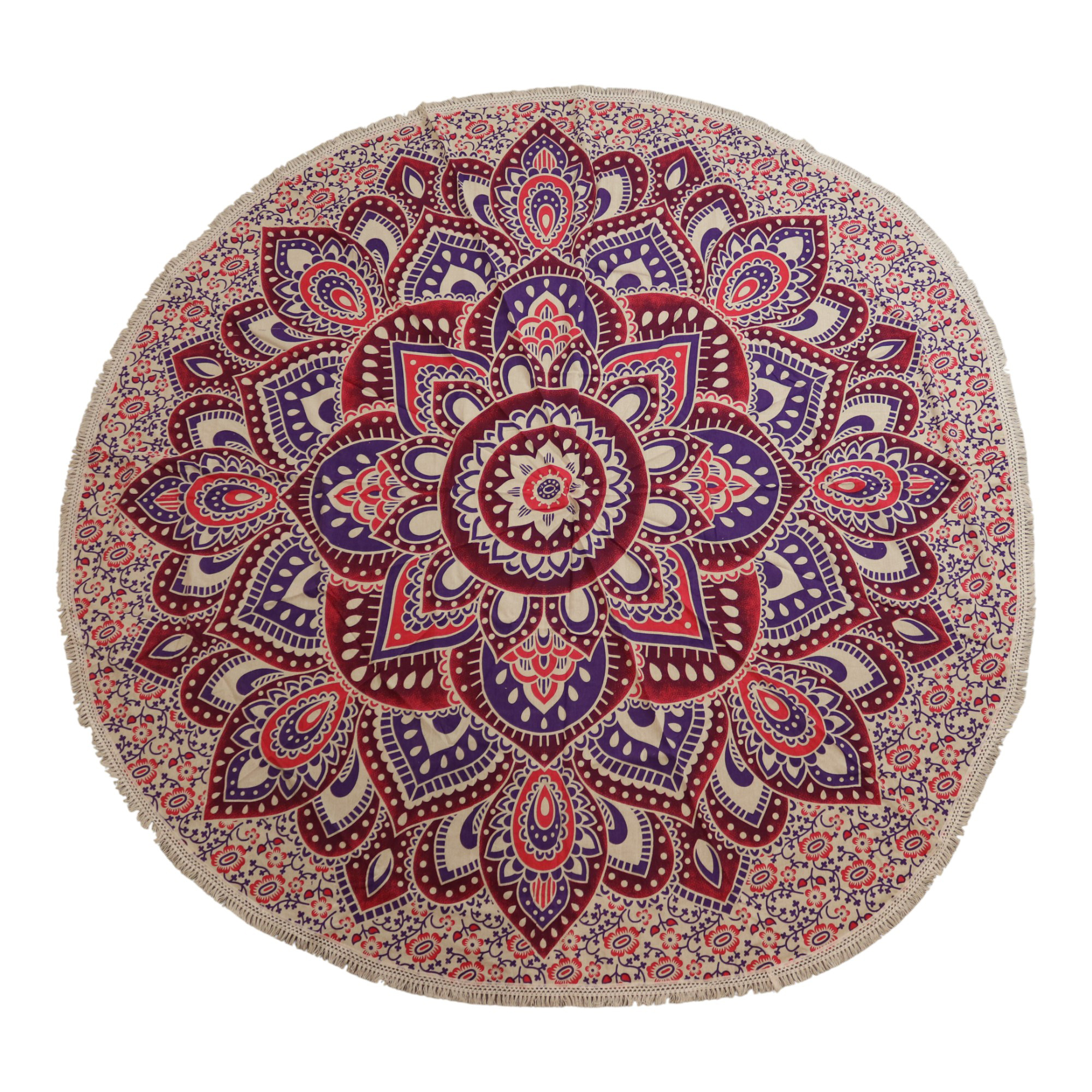 Această pânză rotundă mare Mandala (180 cm) este realizată manual în India și prezintă modele minuțioase în nuanțe delicate de roz și violet, simbolizând armonia, conștiența și pacea interioară. Designul său circular reprezintă unitatea și echilibrul, fiind o completare plină de semnificație pentru orice colecție de decor.