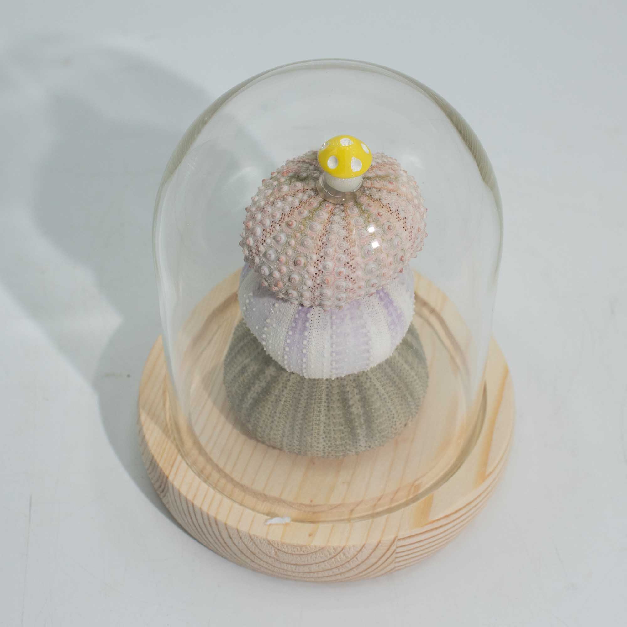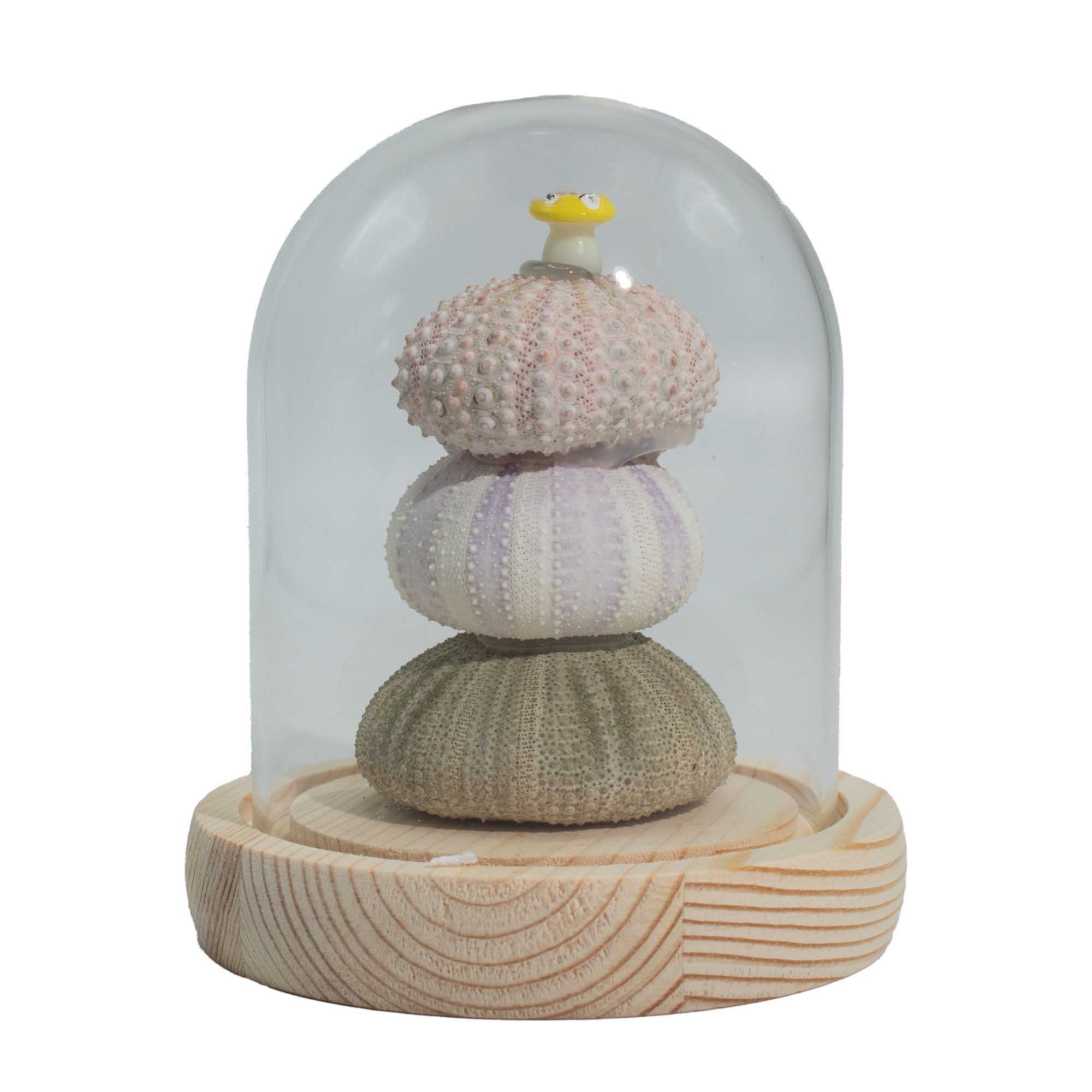 Cupola Luminoasă Florală – 3 Arici de Mare aduce în colecție un element sculptural, orientat spre design. Concepută cu accent pe formă mai degrabă decât pe motive florale, această piesă pune în valoare structura, echilibrul și detaliile de suprafață. Cele trei forme de arici de mare sunt așezate una peste alta sub o cupolă transparentă din sticlă, creând un mic moment sculptural care atrage atenția prin textură și proporții, nu prin culoare.