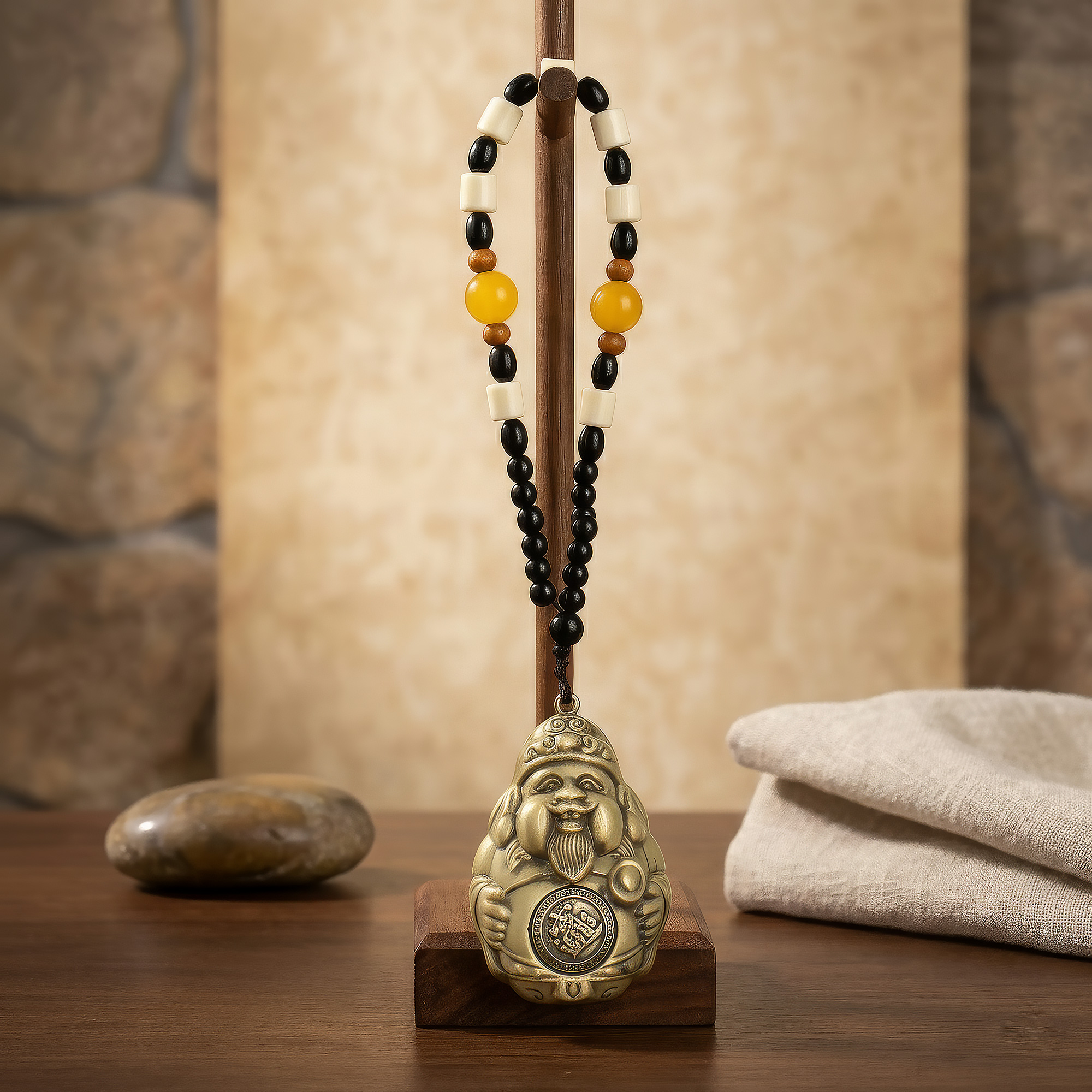 Finisat într-o nuanță metalică caldă și suspendat pe un șnur decorativ cu mărgele, obiectul îmbină semnificația simbolică cu atractivitatea vizuală. În mod tradițional, este amplasat lângă intrări, case de marcat, birouri sau în zonele dedicate prosperității, pentru a „invita” simbolic bunăstarea.