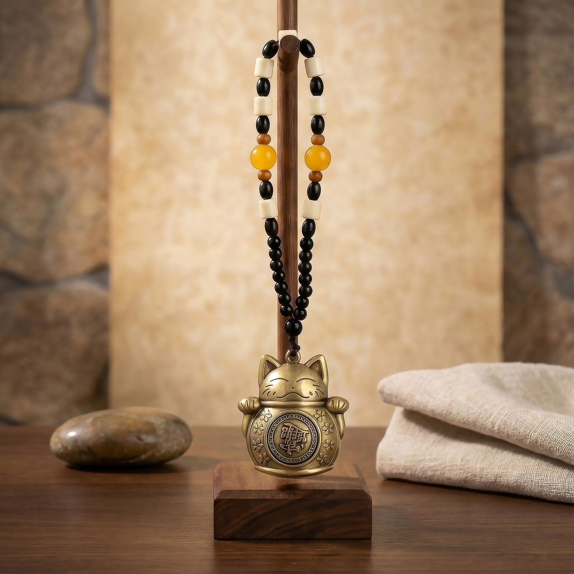 Suspendată pe un șnur decorativ cu mărgele în nuanțe de negru, crem, chihlimbar și lemn, această piesă oferă un contrast vizual echilibrat și o utilizare armonioasă a culorilor Feng Shui. Poate fi ușor amplasată lângă intrări, case de marcat, birouri, rafturi sau în zonele dedicate prosperității din locuință sau spațiul de lucru, unde este folosită tradițional pentru a întâmpina bunăstarea și a proteja energia financiară.