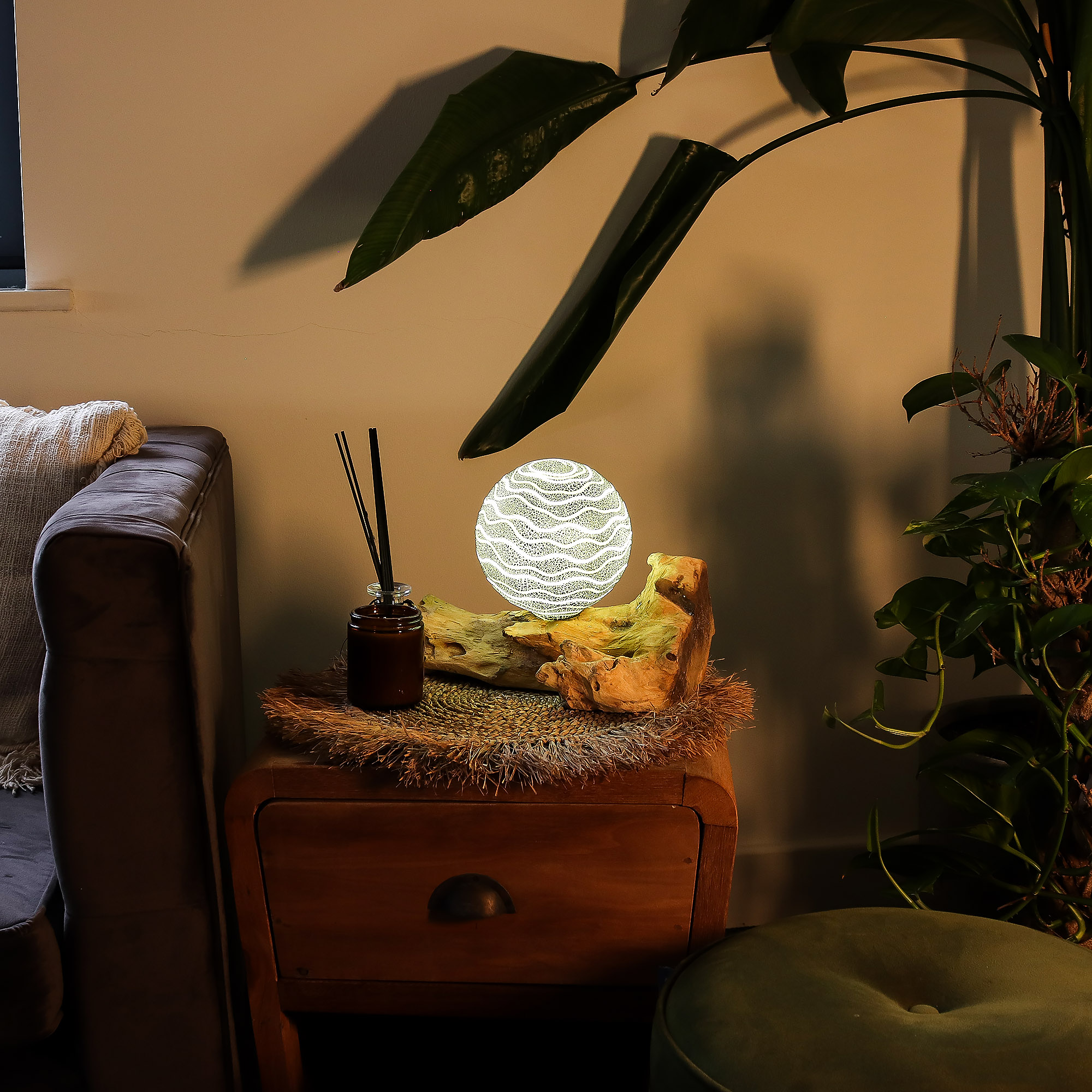 Această lampă aduce în încăpere o lumină calmă, cu strălucire lunară. Abajurul Luna Gri este așezat pe o bucată naturală de lemn drift din Indonezia, oferind un mix de lumină difuză, textură naturală și design sculptural. Are o prezență în același timp naturală și modernă, fiind o piesă de accent ușor de integrat în orice locuință.
