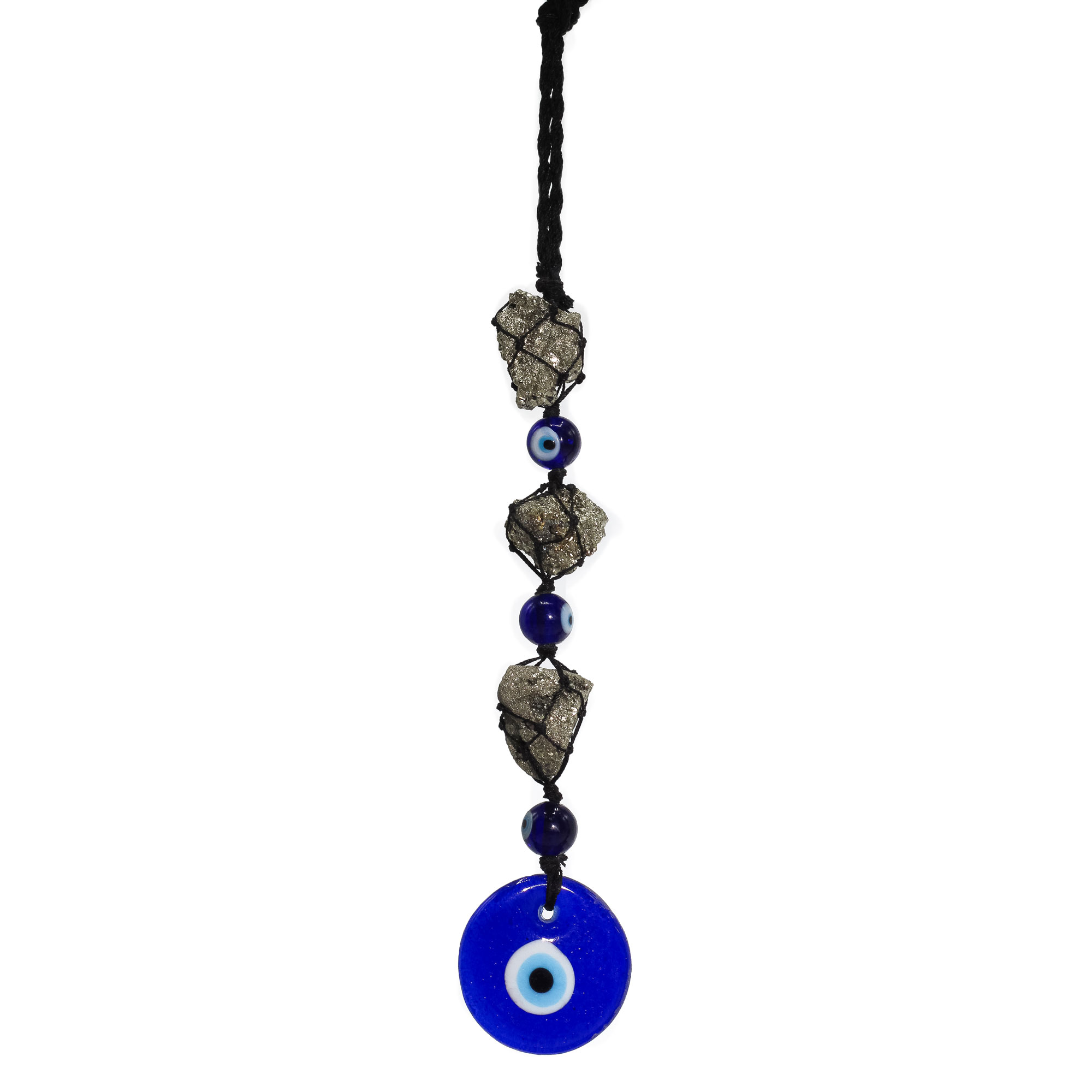 Ochiul Rău este cunoscut tradițional pentru capacitatea sa de a alunga energiile negative și de a atrage norocul, în timp ce Pirită, numită adesea „piatra abundenței”, este apreciată pentru proprietățile sale energizante și protectoare. Împreună, creează o combinație armonioasă ce inspiră încredere, pozitivitate și stabilitate. Fiecare pandantiv este realizat manual, cu pietre de pirită lustruite și mărgele asortate, suspendate într-un design minimalist, potrivit oricărui decor.