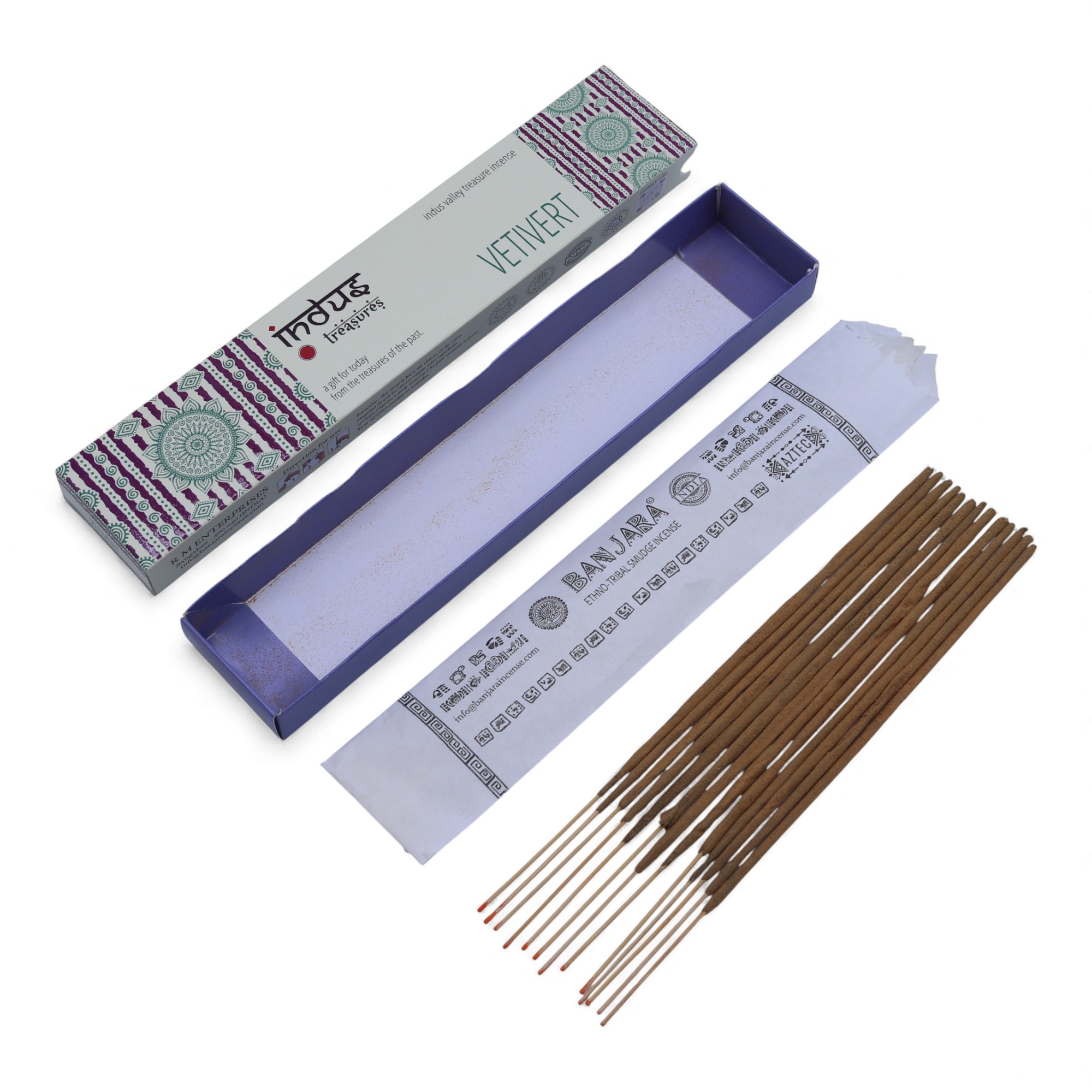 Bețișoarele Parfumate Indus Treasures Vetivert au o aromă răcoroasă, pământie, cu note ușor afumate, care oferă o senzație de stabilitate și ancorare.