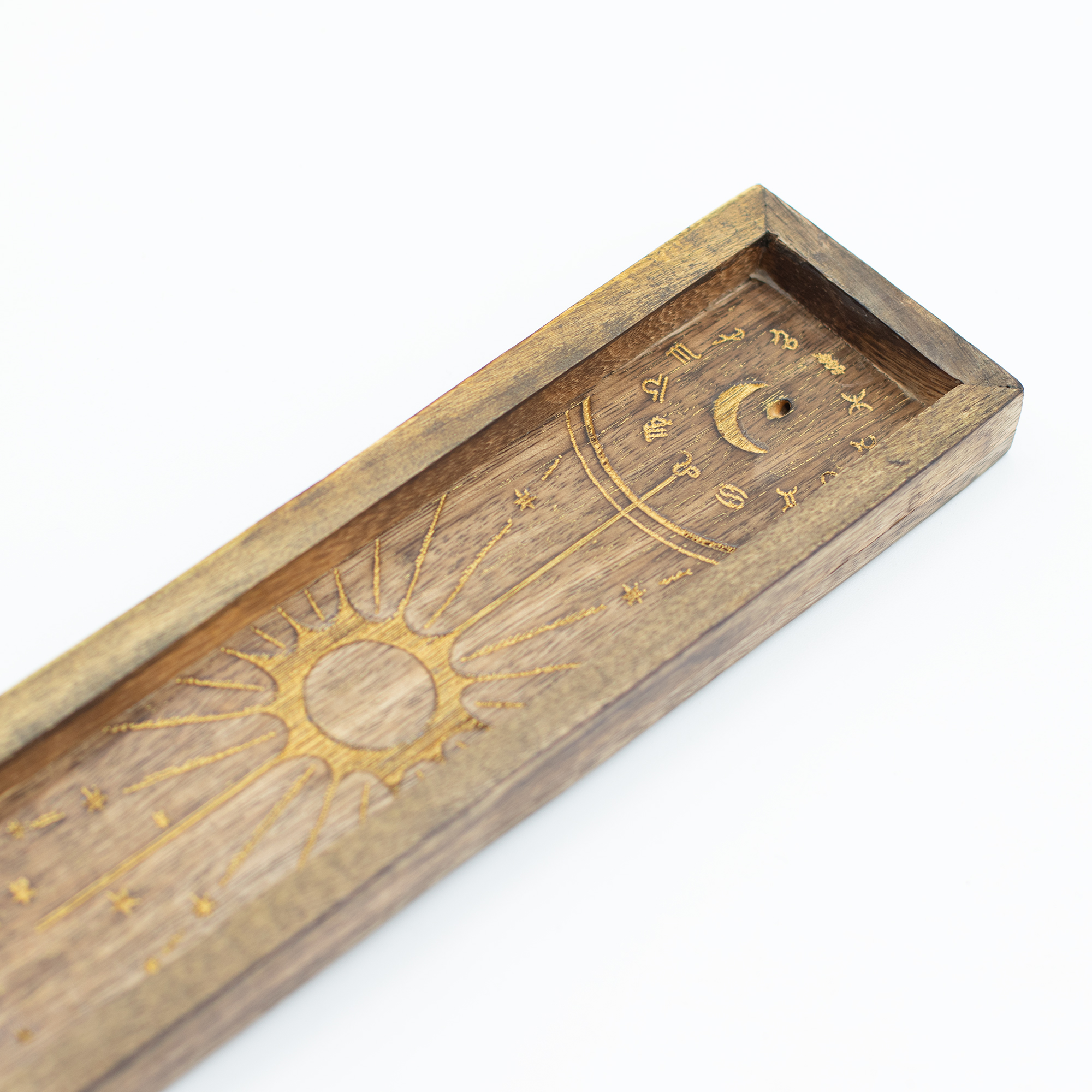 Confecționat din lemn cu o nuanță rustică plăcută, fiecare suport este decorat cu un motiv solar înconjurat de simboluri zodiacale. Are un locaș special pentru bețișoare parfumate și margini ușor ridicate pentru a reține cenușa. Forma alungită este ideală pentru expunerea cristalelor șlefuite sau pentru a fi plasat lângă alte produse spirituale, fie la casa de marcat, fie în zona dedicată altarului.