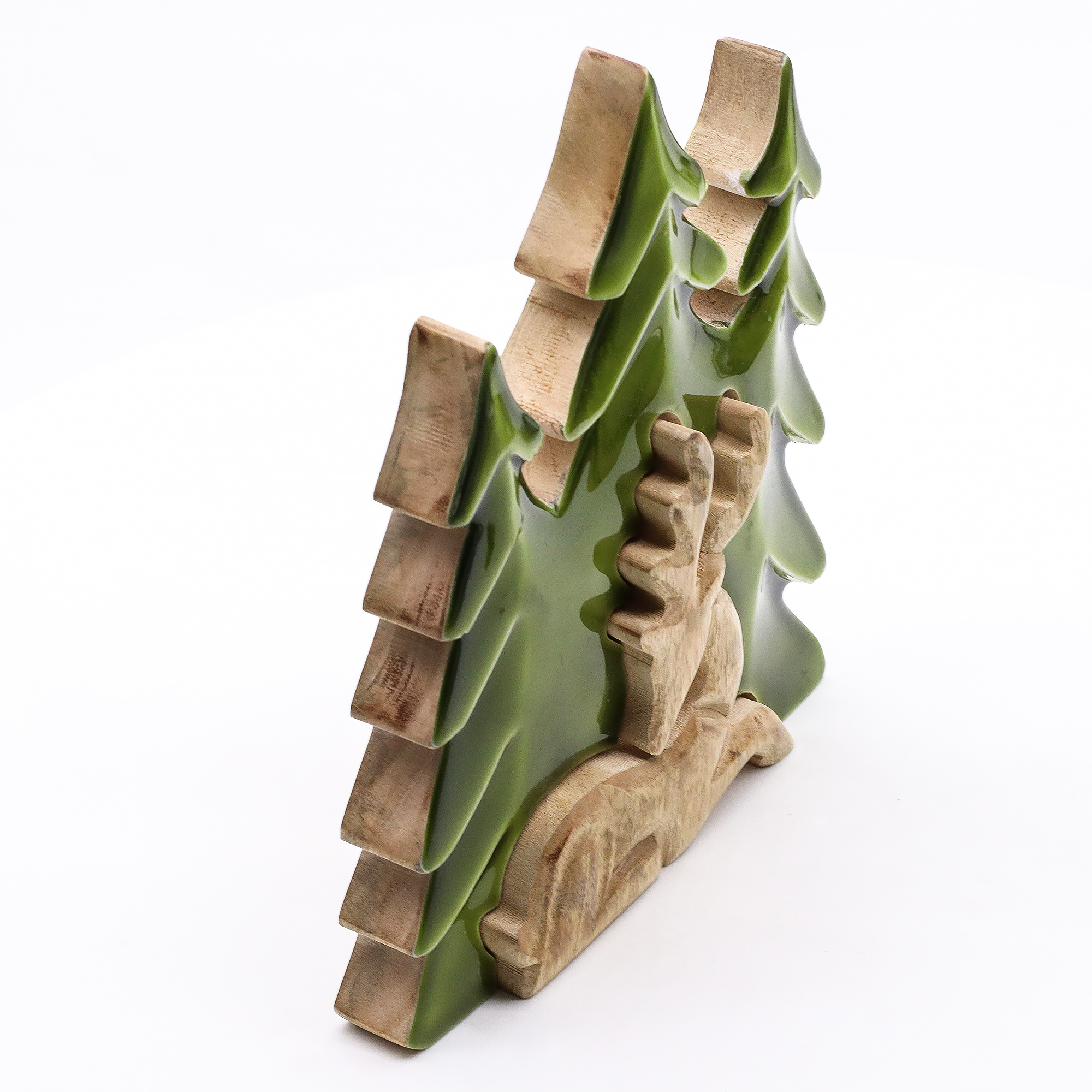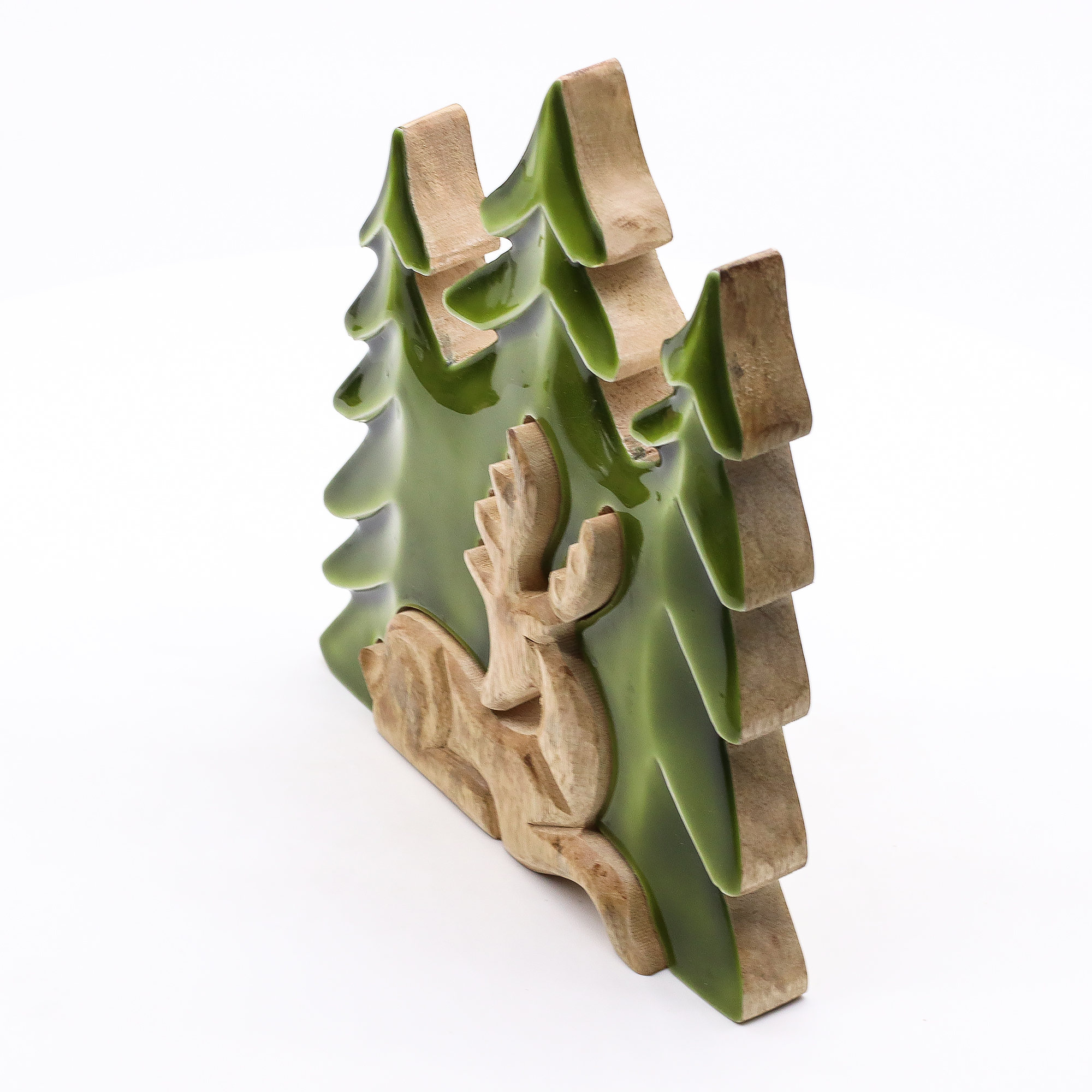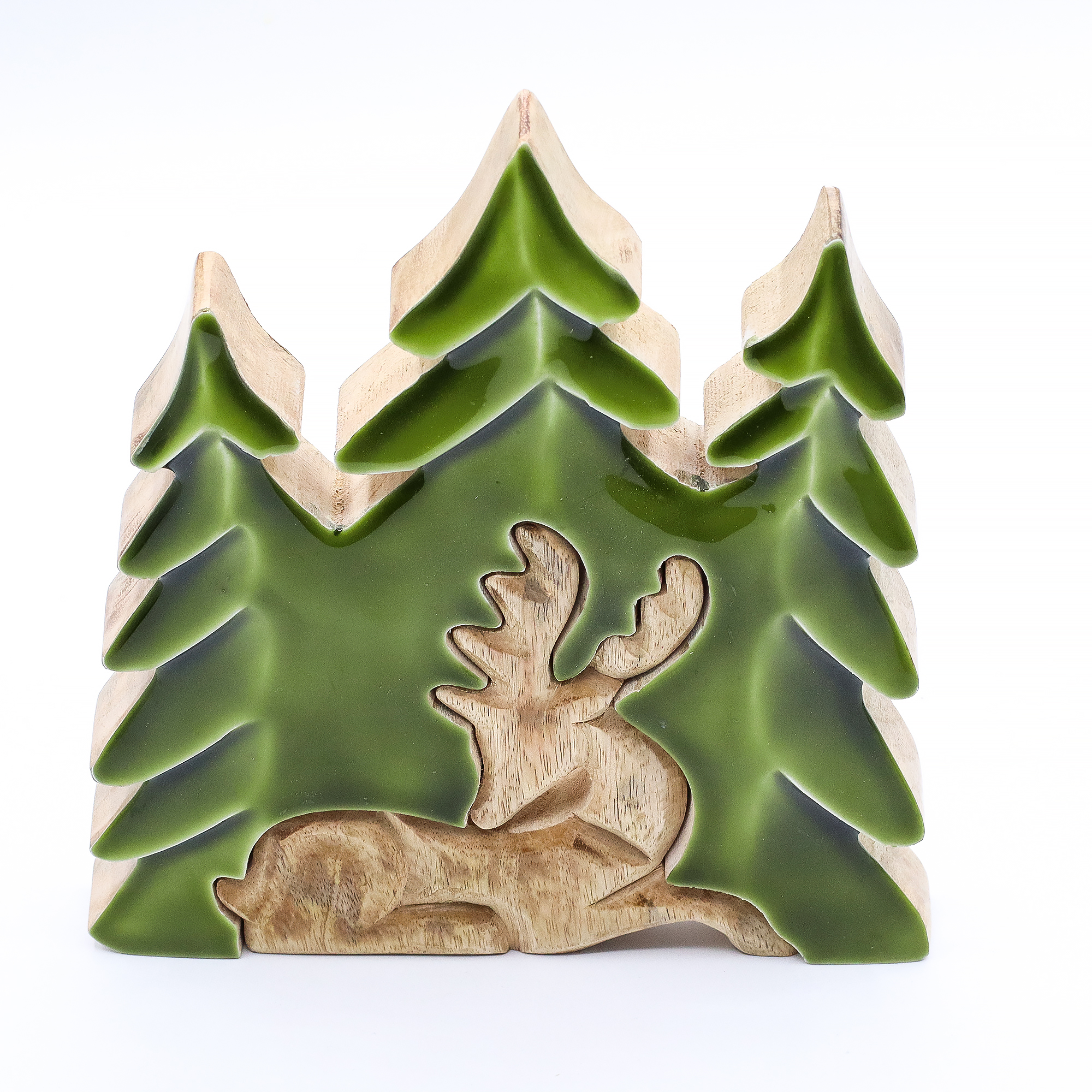 Această decorațiune 3D impunătoare surprinde măreția faunei sălbatice din pădure. Sculptată manual în India din lemn de mango sustenabil, piesa redă într-un mod expresiv un cerb în mijlocul pădurii, într-o compoziție tridimensională plină de profunzime. Finisajul lucios din smalț scoate în evidență textura naturală a lemnului, completată de accente verzi intense care evocă bogăția și liniștea naturii.