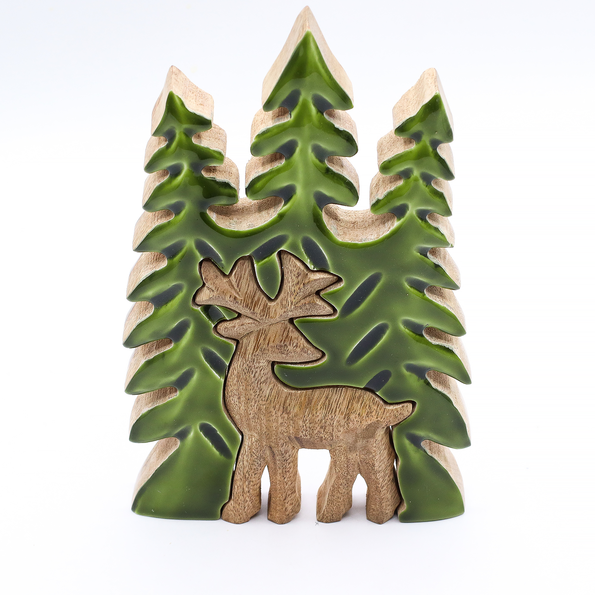 Această decorațiune 3D impresionantă surprinde măreția pădurii într-un mod artistic și elegant. Sculptată manual în India din lemn de mango sustenabil, redă un cerb tridimensional într-un decor de pădure, cu detalii care atrag imediat privirea. Finisajul lucios din smalț îmbină armonios textura rustică a lemnului cu accente verzi vibrante, aducând liniștea naturii în interior.