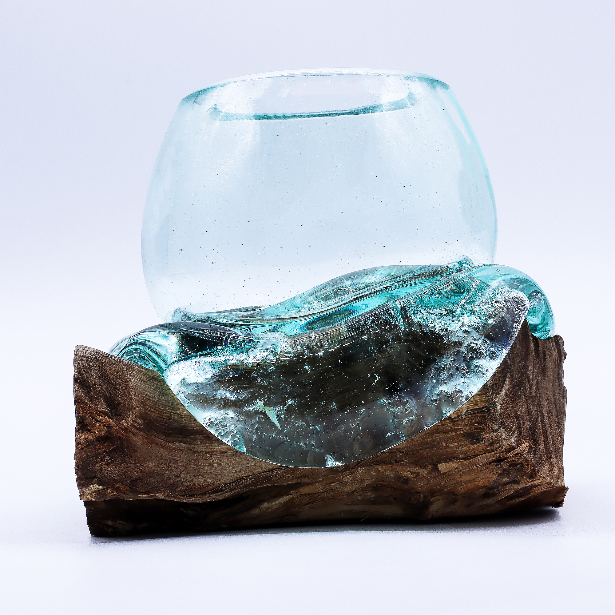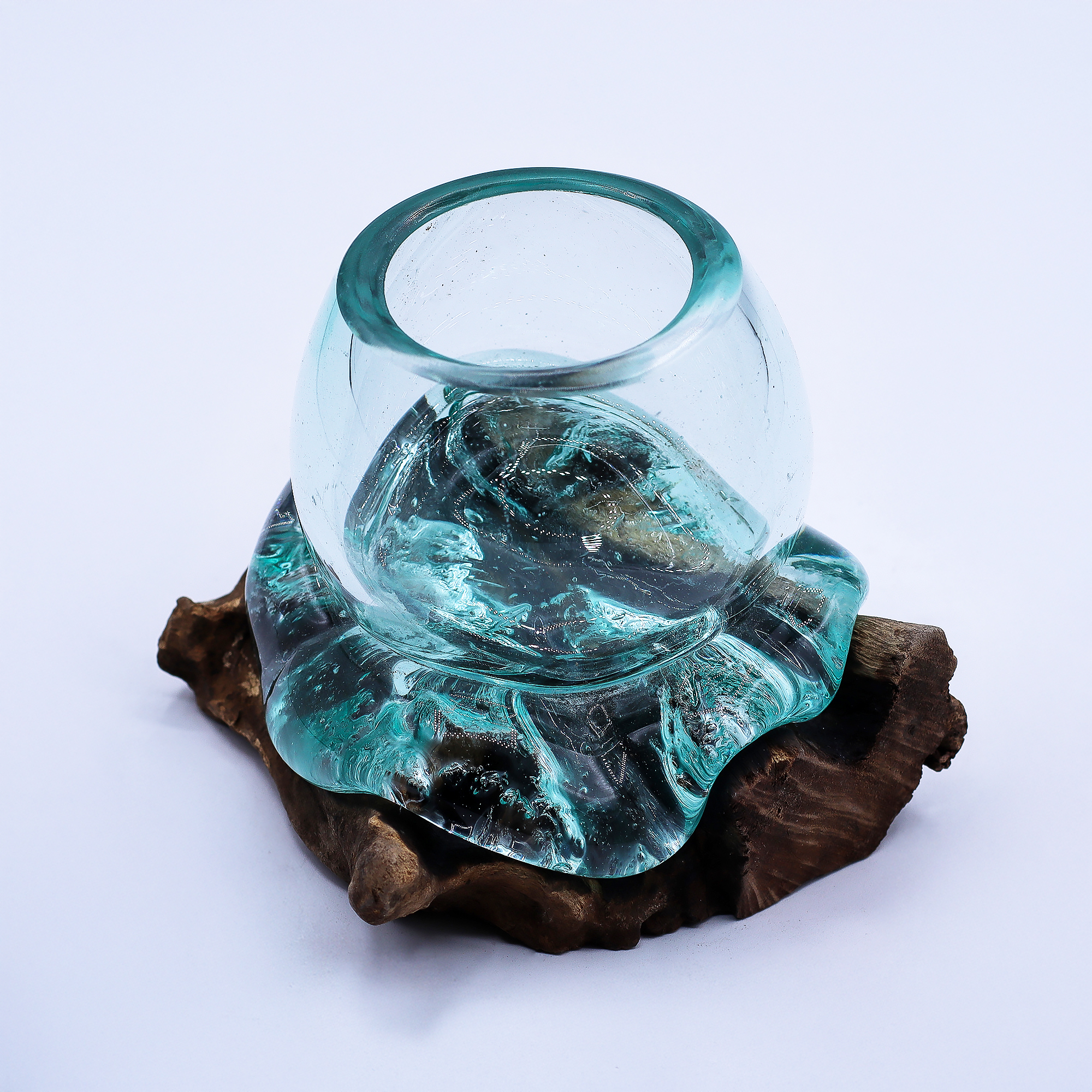 Realizat manual în Bali din sticlă reciclată și lemn de Gamal provenit din surse sustenabile, fiecare piesă este modelată individual, prin turnarea sticlei fierbinți direct peste lemnul natural, formând o bază naturală perfect adaptată formei sale. Rezultatul este o sculptură unică, care îmbină frumusețea artistică cu funcționalitatea unui bol decorativ.