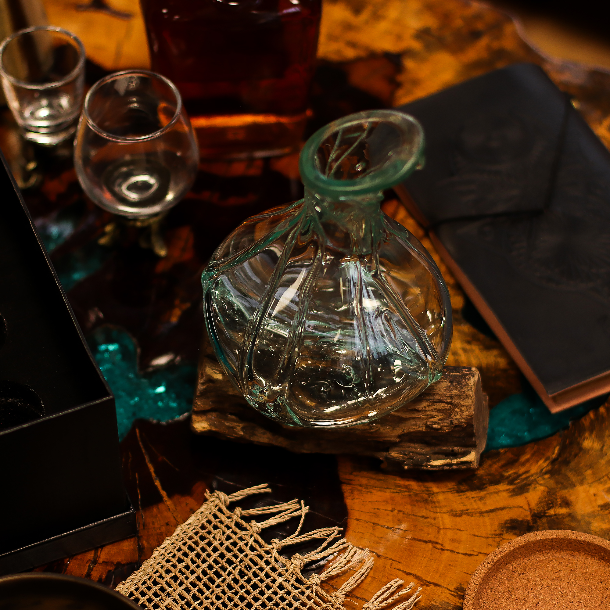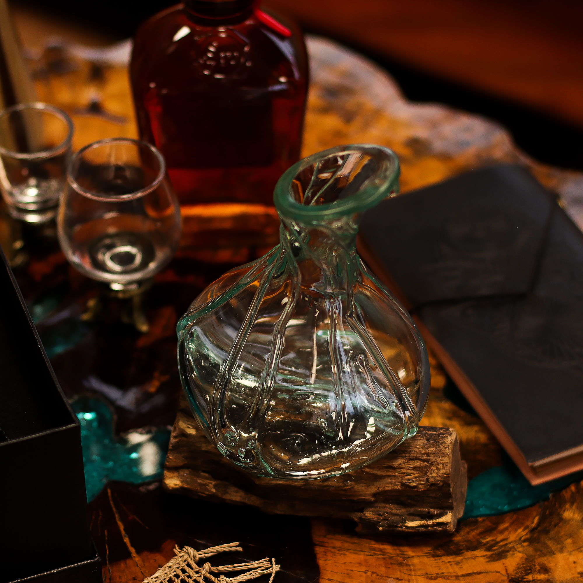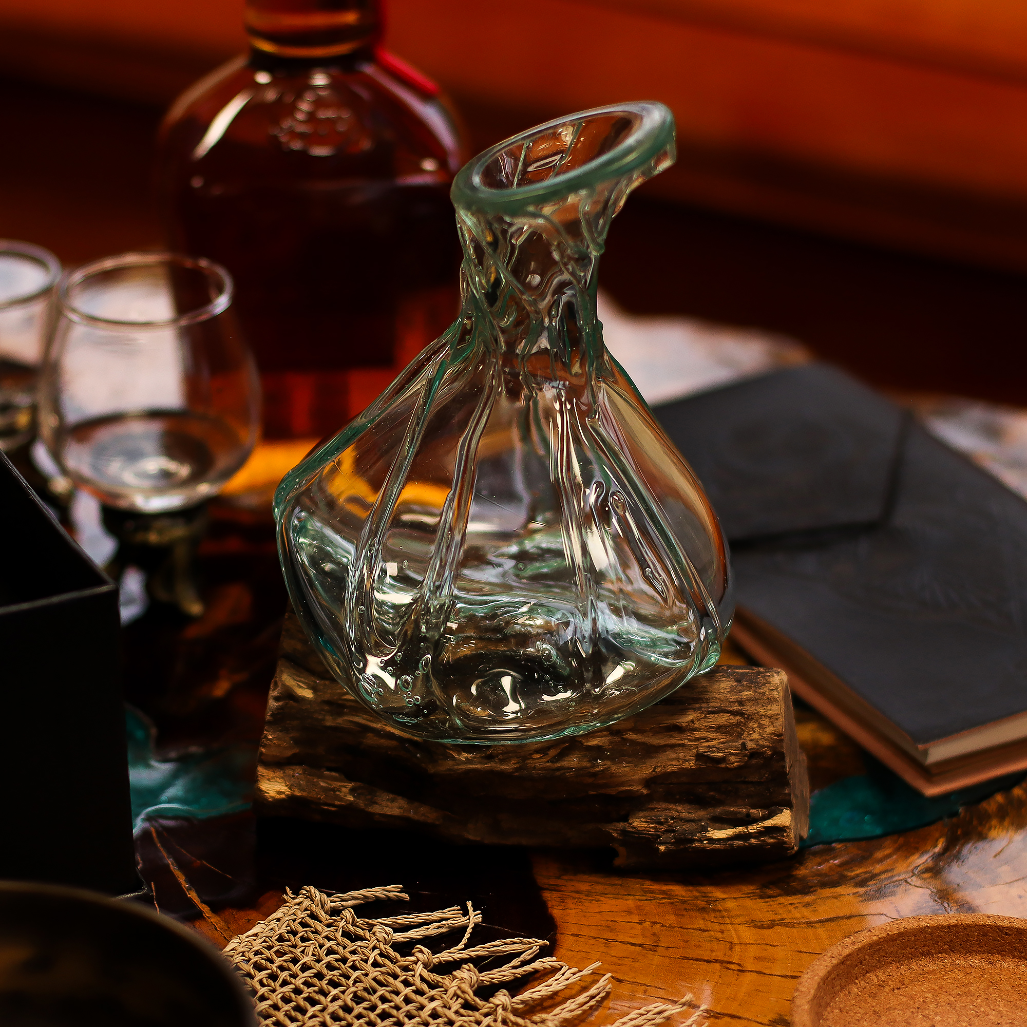 Fiecare piesă este suflată manual din sticlă reciclată și se așază elegant pe o bază din lemn natural, modelată odată cu răcirea sticlei pentru a obține o potrivire perfectă. Silueta sa elegantă și textura organică îl fac ideal atât ca o carafă funcțională pentru vin sau apă, cât și ca obiect decorativ sofisticat.