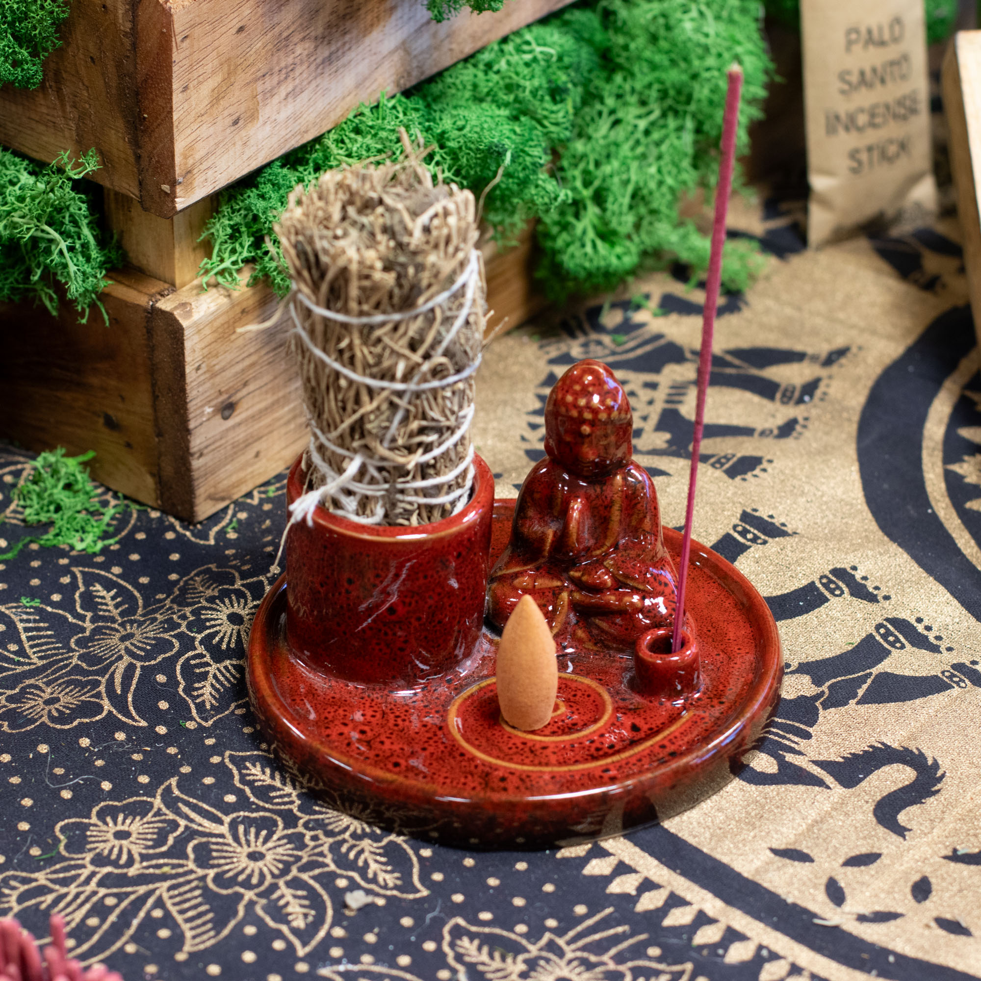 Suportul prezintă un Buddha așezat pe o bază circulară, cu suporturi integrate pentru bețișoare și conuri de tămâie. Glazura roșu delicat are un caracter pământiu, cu variații subtile, care oferă fiecărei piese un aspect lucrat manual, ușor de apreciat de către clienți. Conceput pentru ritualuri zilnice, suportul colectează cenușa în mod ordonat și funcționează totodată ca un punct decorativ de interes.
