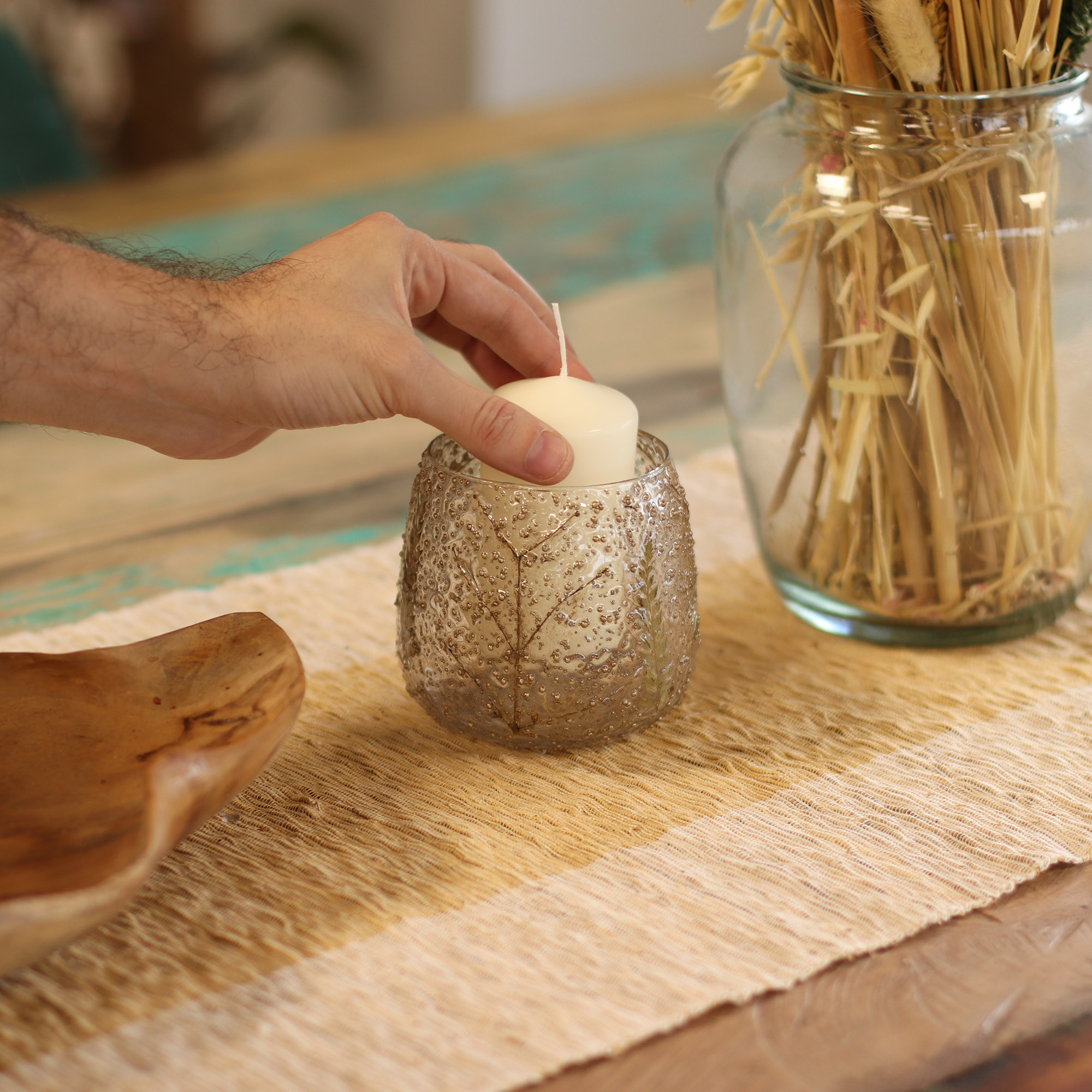 Suportul de Lumânare Sticlă Naturală cu Motiv Floral – Trandafir oferă un amestec elegant de sticlă reciclată și petale reale de trandafir uscate, conferind fiecărei piese un caracter romantic și artizanal. Sticla transparentă pune în valoare detaliile florale delicate, transformând acest suport într-un accent botanic remarcabil pentru orice afișaj.