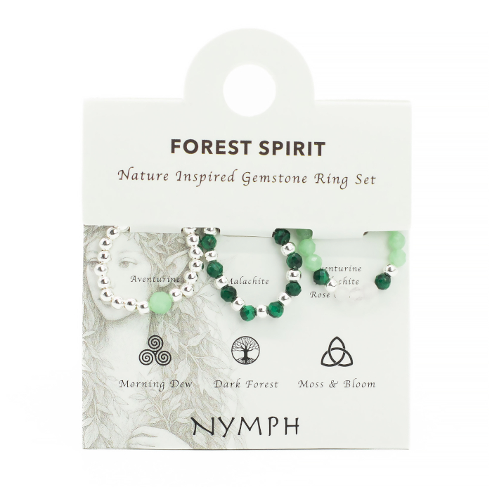 Setul de Inele Spiritul Pădurii este un trio de inele cu pietre prețioase, inspirat din natură, cu rădăcini în poteci împădurite, acoperite de mușchi, și în magia liniștită a pădurii. Cu Aventurin, Malachit și Cuarț Roz, paleta cromatică se mișcă între tonuri de verde proaspăt și nuanțe delicate de roz, oferind un aspect echilibrat și blând.