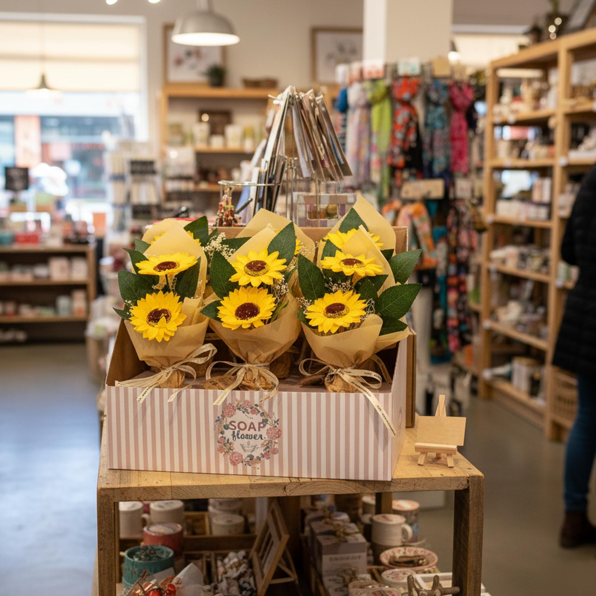 Adăugați o notă de căldură aurie în magazinul dvs. cu acest display Gata de Vânzare – Buchet din Flori de Săpun cu Două Floarea-Soarelui.