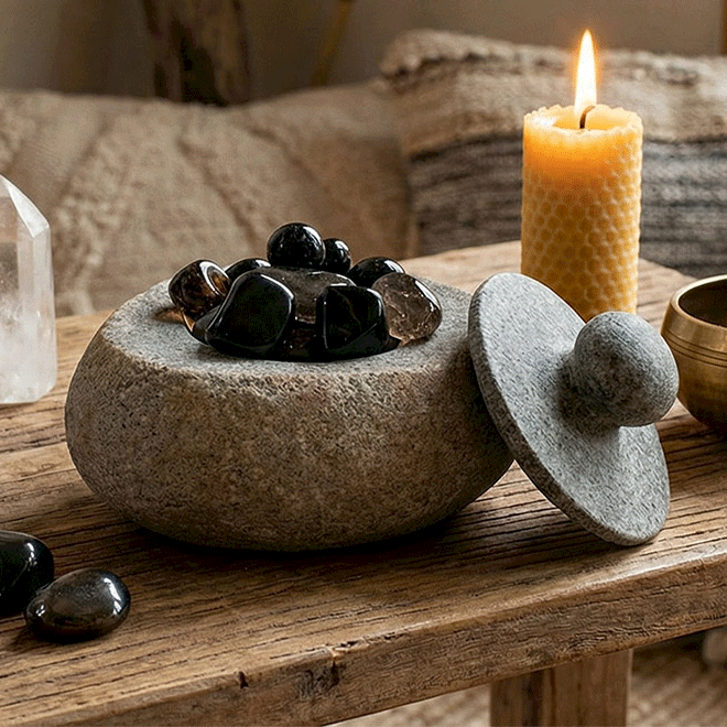 Fiecare formă este creată de natură şi rafinată cu grijă manual, rezultând un echilibru armonios între materialul brut şi măiestria artizanală. Unele tradiţii sugerează că aceste pietre pot acţiona ca vase de împământare, ajutând la reechilibrarea sau stabilizarea pietrelor semipreţioase şi a bijuteriilor cu cristale aşezate în interior. Această credinţă a inspirat denumirea de „Grounding Pots”.