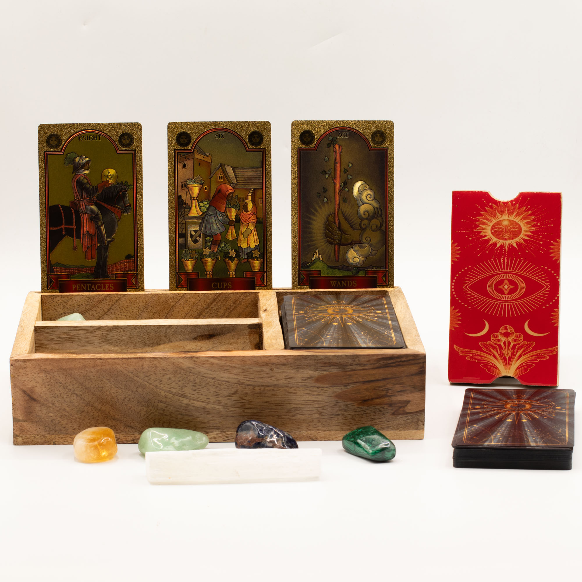 Concepută pentru citiri mai ample, această cutie pentru tarot din lemn de mango oferă trei compartimente interne, susținând o abordare mai structurată și complexă a depozitării și utilizării cărților. Dispunerea compartimentată permite organizarea ordonată a pachetelor de cărți, etalărilor sau cardurilor de referință, iar suportul frontal integrat creează un punct focal clar pentru o carte aleasă, atât în timpul citirilor, cât și în expunerile din magazin.