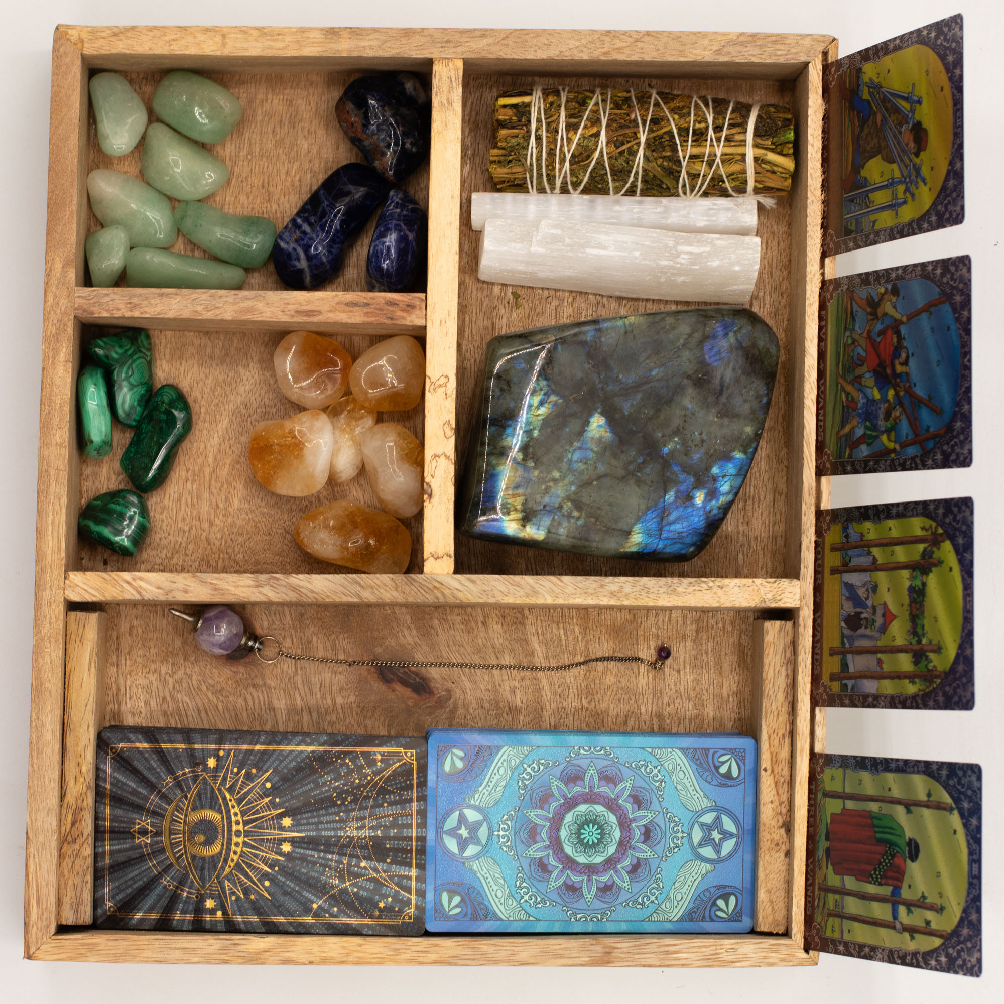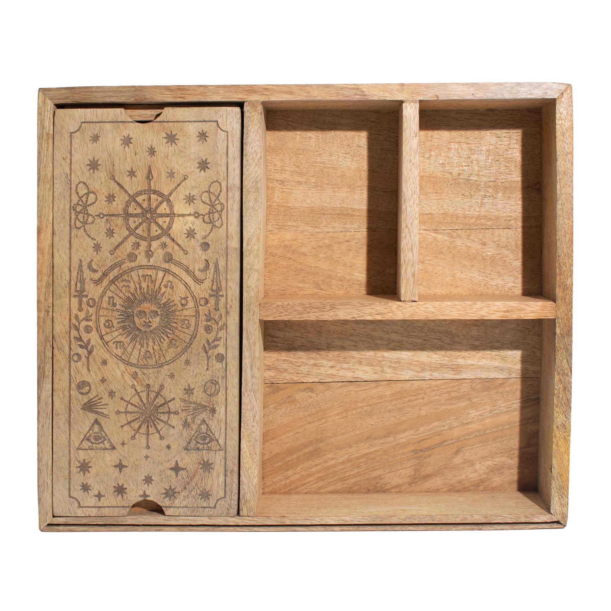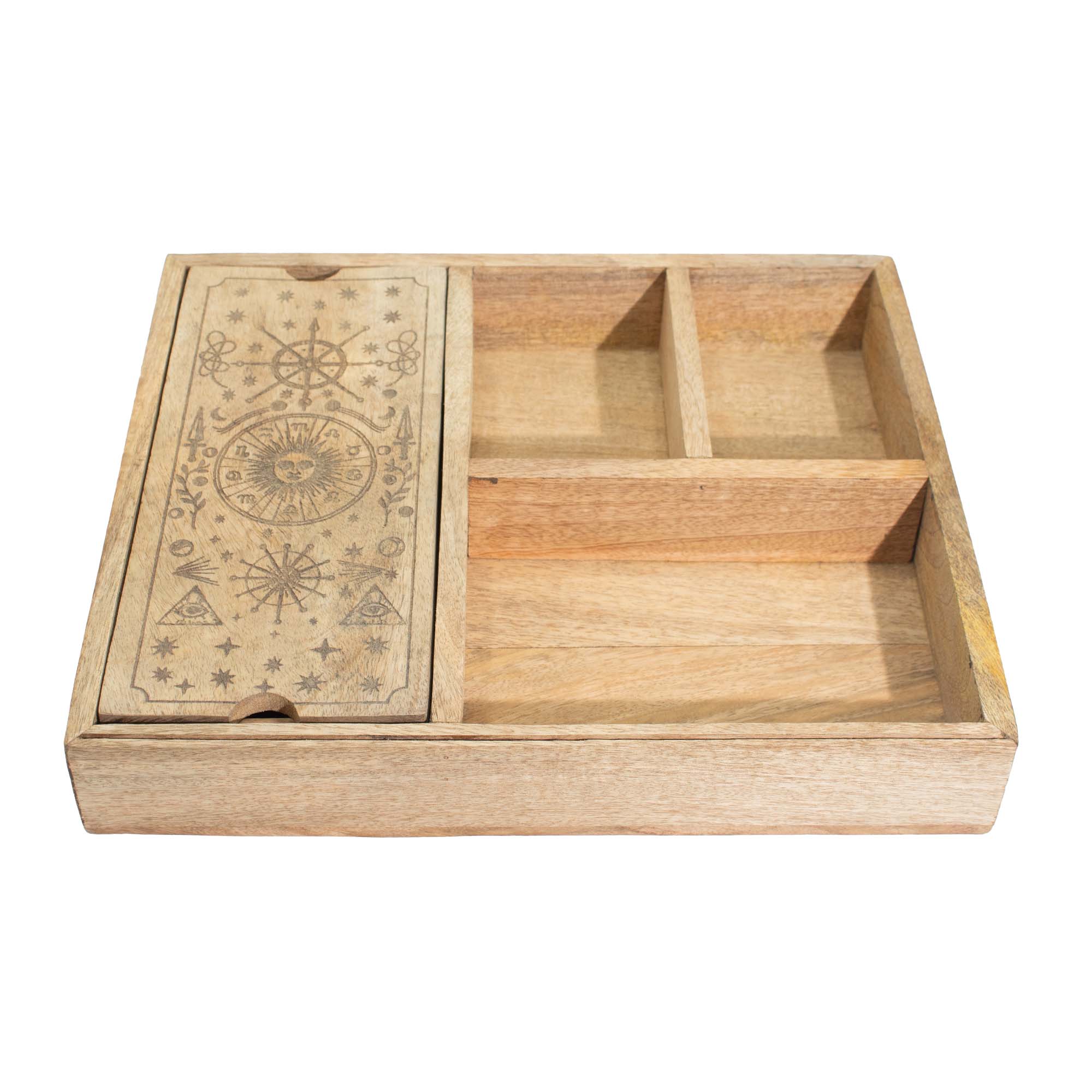 Concepută pentru citiri mai ample, această cutie pentru tarot din lemn de mango oferă trei compartimente interne, susținând o abordare mai structurată și complexă a depozitării și utilizării cărților. Dispunerea compartimentată permite organizarea ordonată a pachetelor de cărți, etalărilor sau cardurilor de referință, iar suportul frontal integrat creează un punct focal clar pentru o carte aleasă, atât în timpul citirilor, cât și în expunerile din magazin.