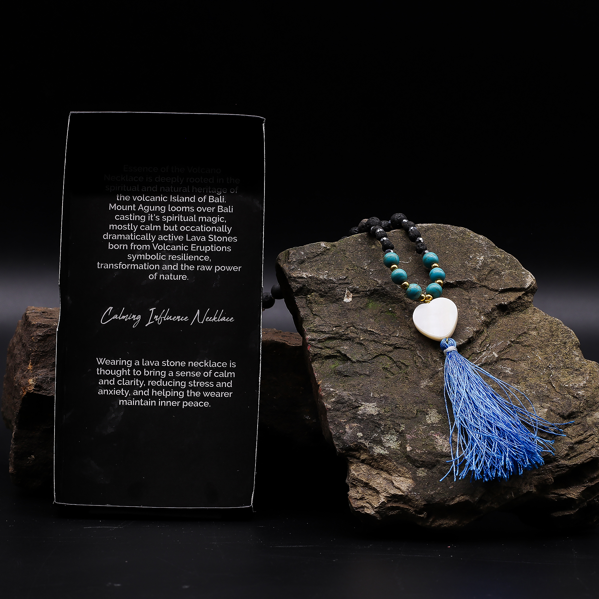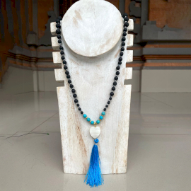 Cu ciucurele său albastru delicat și pietrele vulcanice cu efect de împământare, acest colier întruchipează seninătatea și echilibrul emoțional.