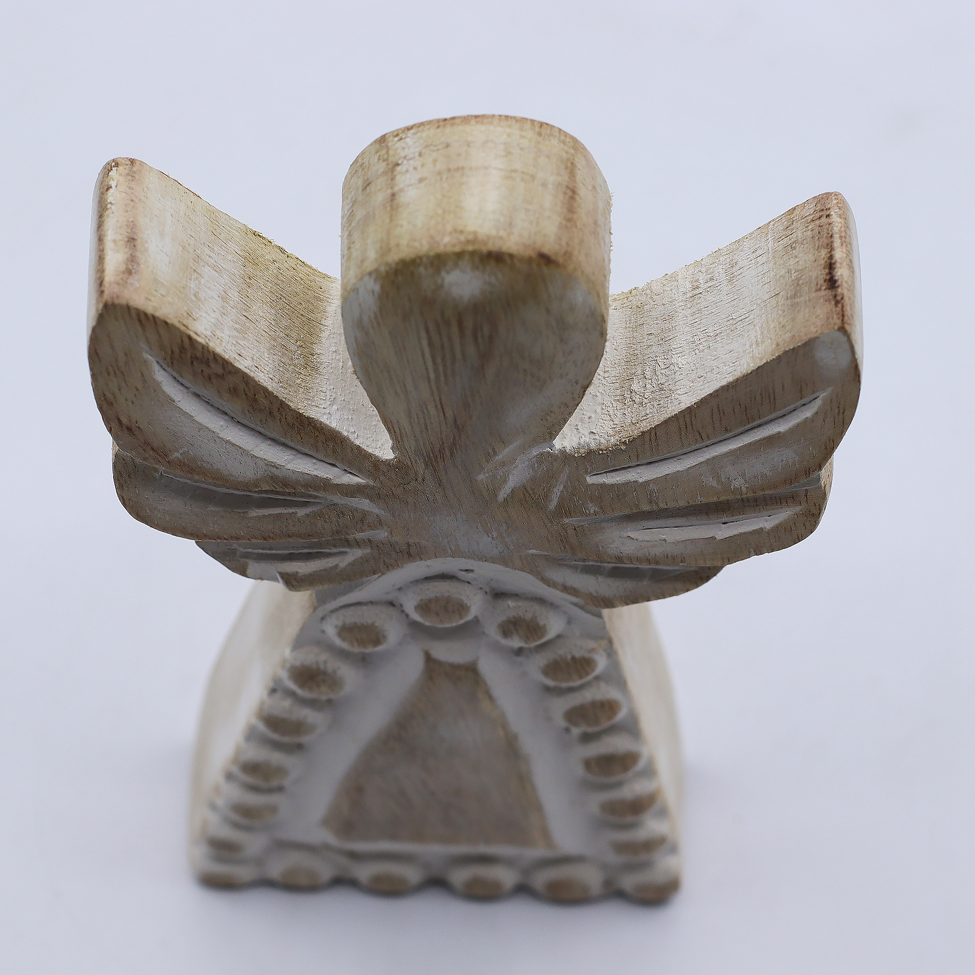 Acest înger liniștit din lemn de mango, cu o înălțime de 13 cm, adaugă o notă de calm și farmec rustic oricărui decor. Sculptat manual în India din lemn de mango sustenabil, este finisat cu un strat alb spălăcit delicat, care evidențiază frumos fibra naturală a lemnului. Fiecare piesă este realizată individual, în condiții de comerț echitabil, și reflectă autenticitatea lucrului manual.