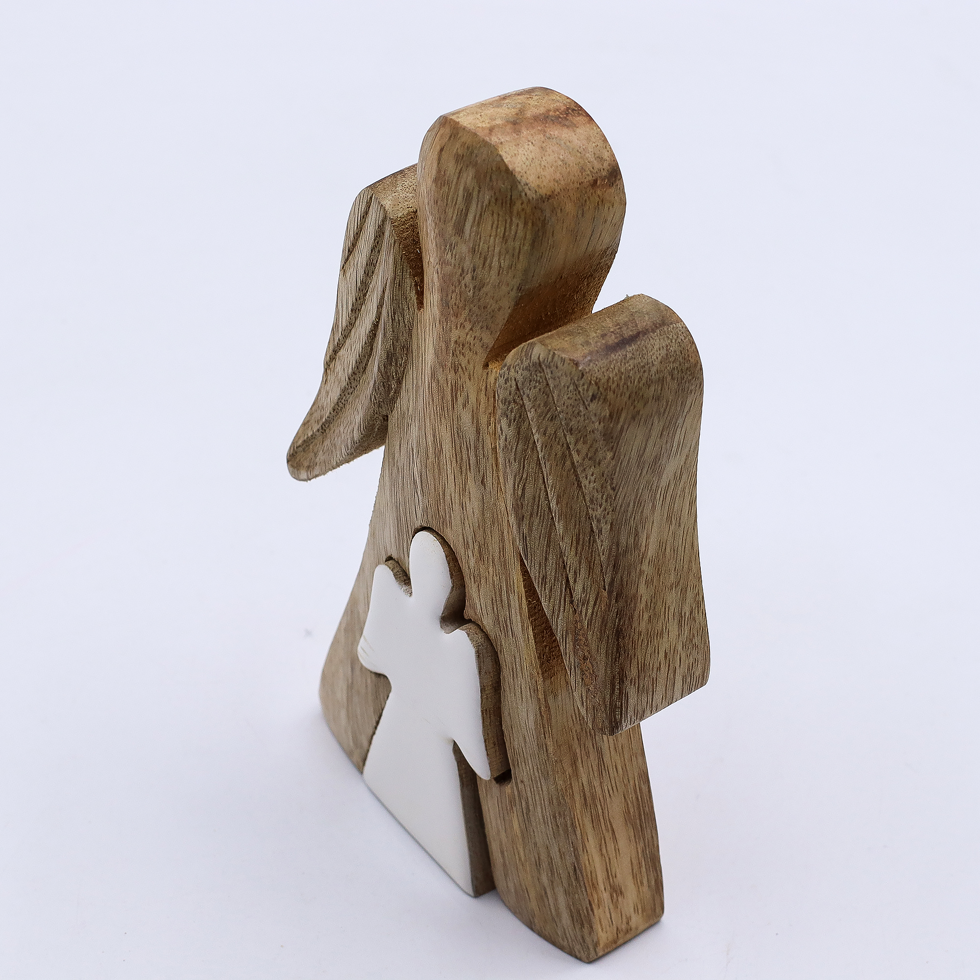 Acest înger remarcabil de 15 cm prezintă un design unic „înger în înger”, care îmbină forma atemporală cu o notă modernă. Sculptat manual în India din lemn de mango sustenabil, este finisat cu un strat neted de smalț alb ce accentuează silueta sa elegantă. Fiecare piesă este realizată individual, în condiții de comerț echitabil, reflectând calitatea și autenticitatea meșteșugului artizanal.
