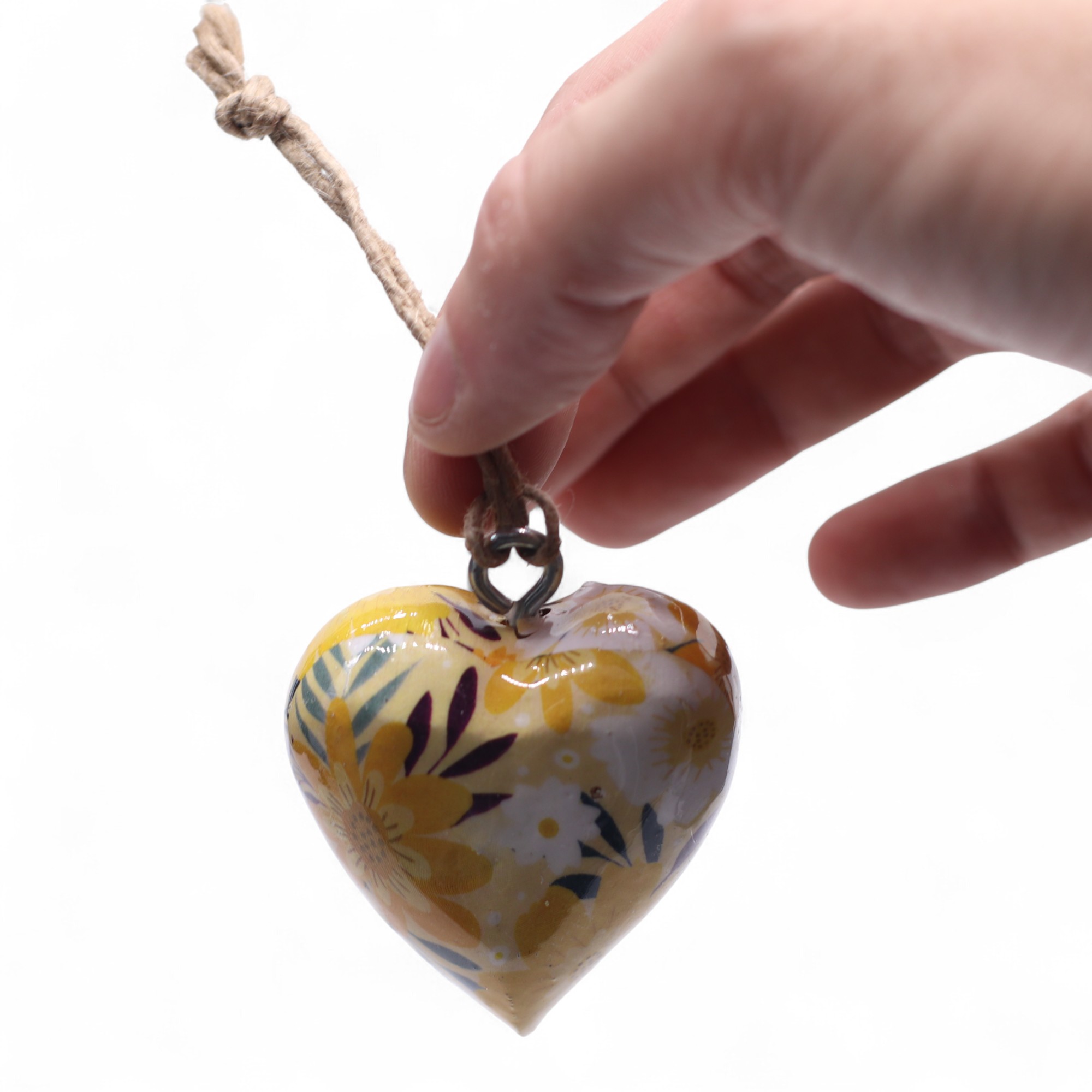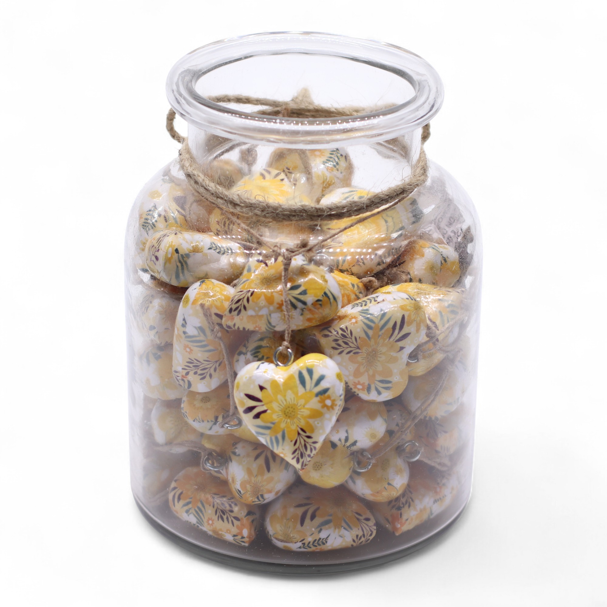 Înviorați-vă expunerea sezonieră cu acest borcan vesel ce conține aprox. 50 de Inimi Mari din Lemn Decorativ Floral Galben, fiecare decorată cu un model luminos, inspirat de stilul vintage.