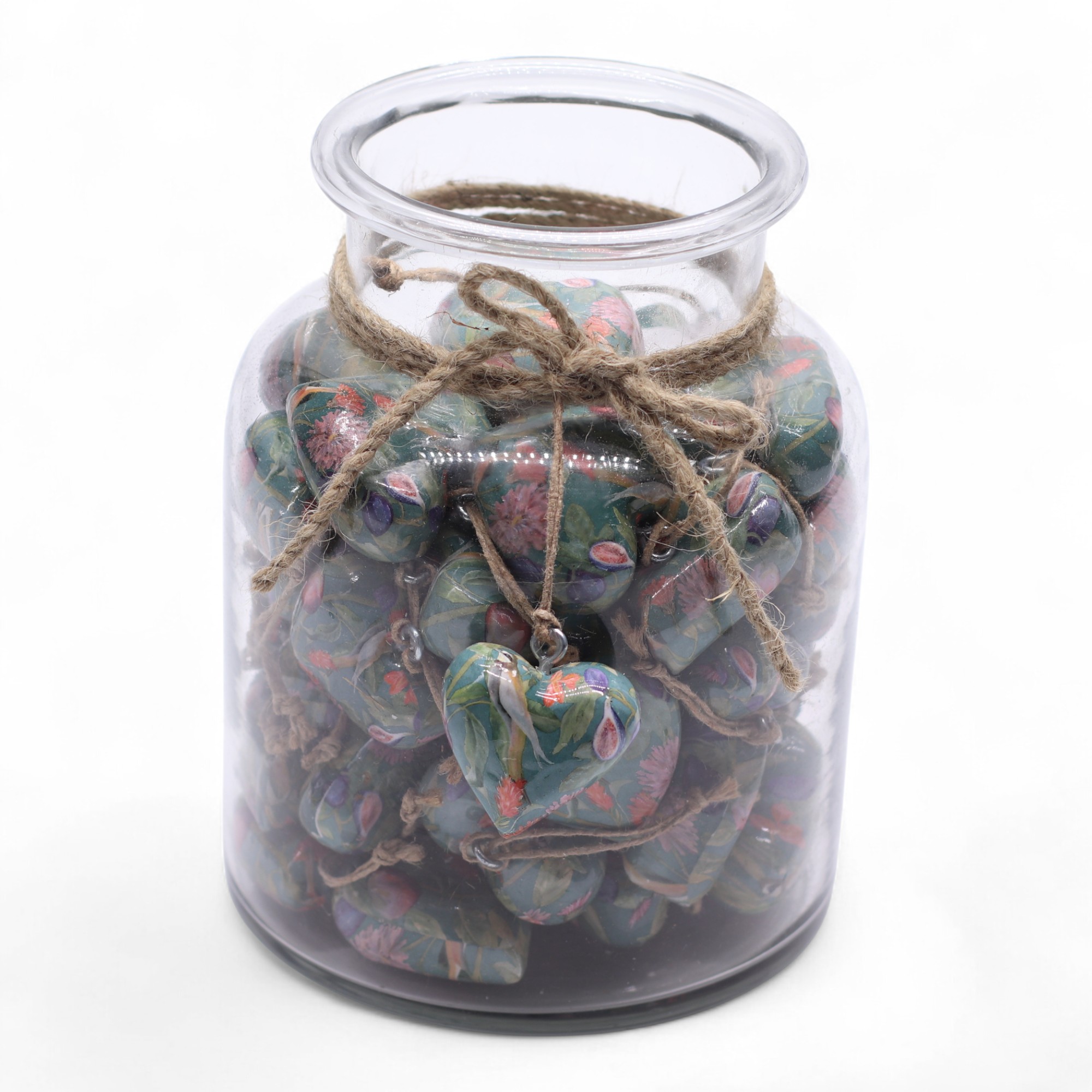 Completați-vă gama sezonieră cu acest borcan de expunere fermecător, ce conține aprox. 50 de Inimi Mari din Lemn Decorativ Păsări și Floral.